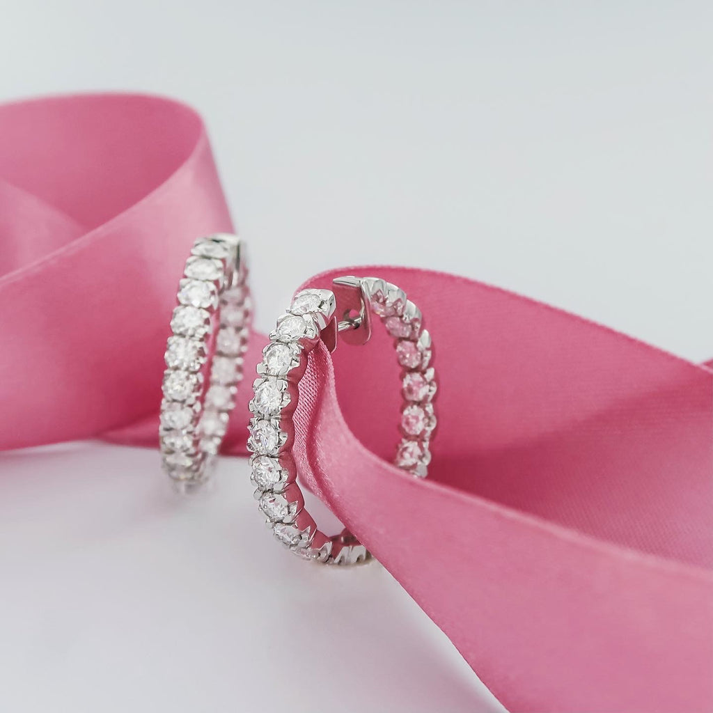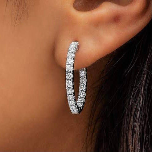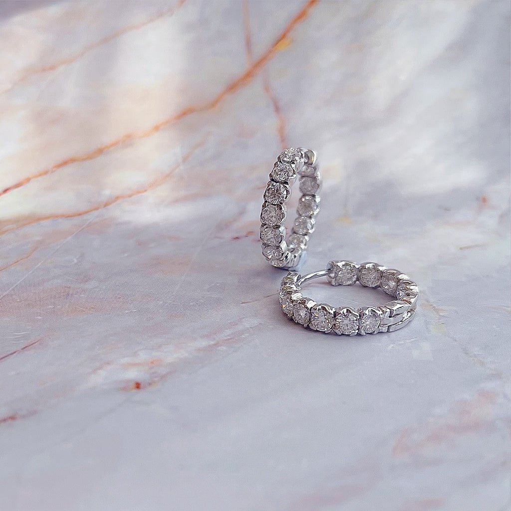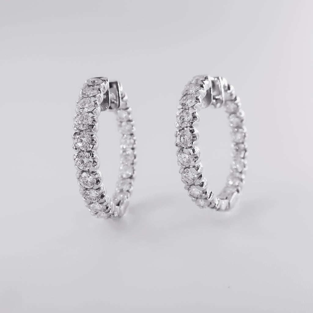 Beautiful HERA features a 2.5CTW  brilliant round cut diamonds crafted on the front and inside back of 18k white gold hoop earrings.