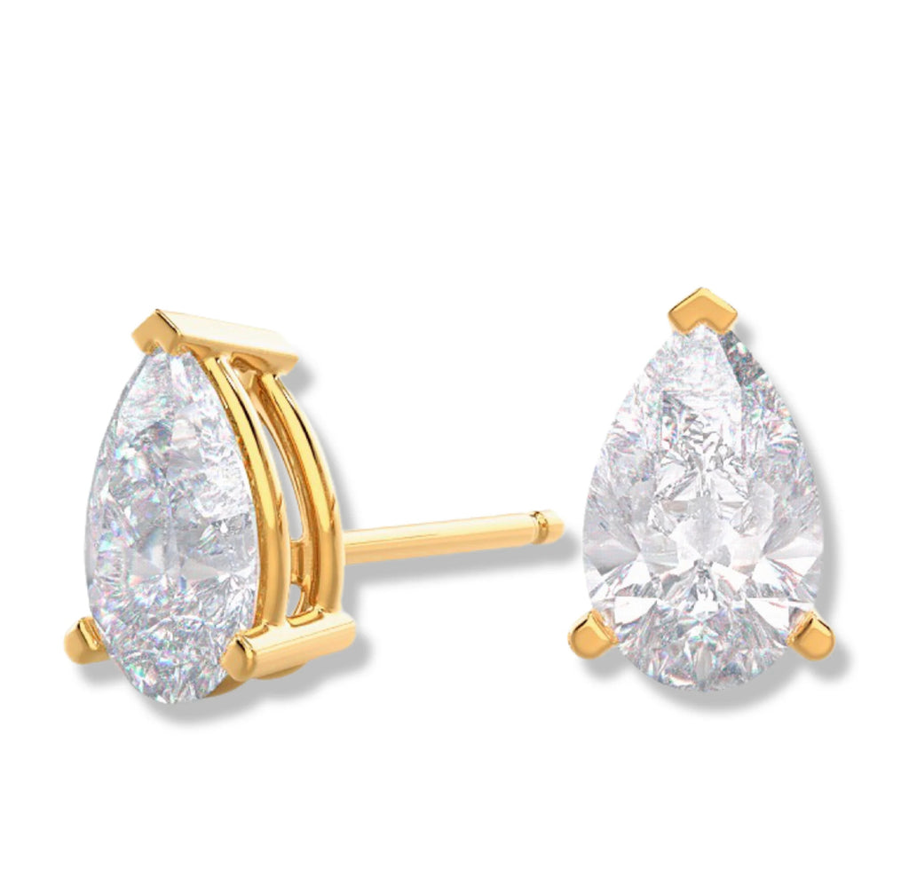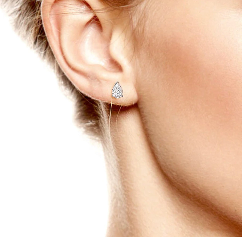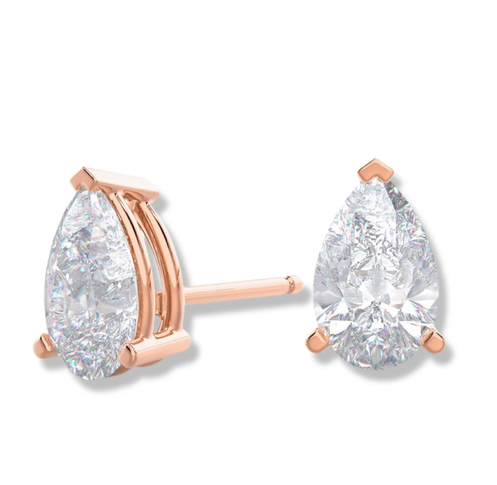 Simple and Classic. Matching pear-shaped diamonds in 18k white, yellow or rose gold three prong baskets.
