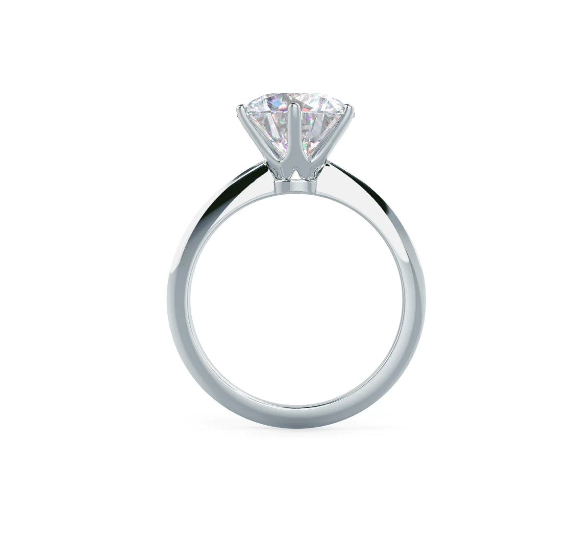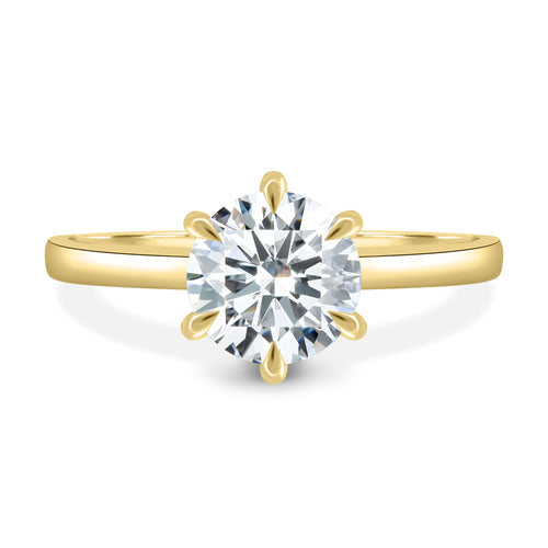 A sophisticated classic solitaire diamond ring that consists of a round tapered plain shank with a six prong setting and a pointed prong finish with unique floral side profile.
