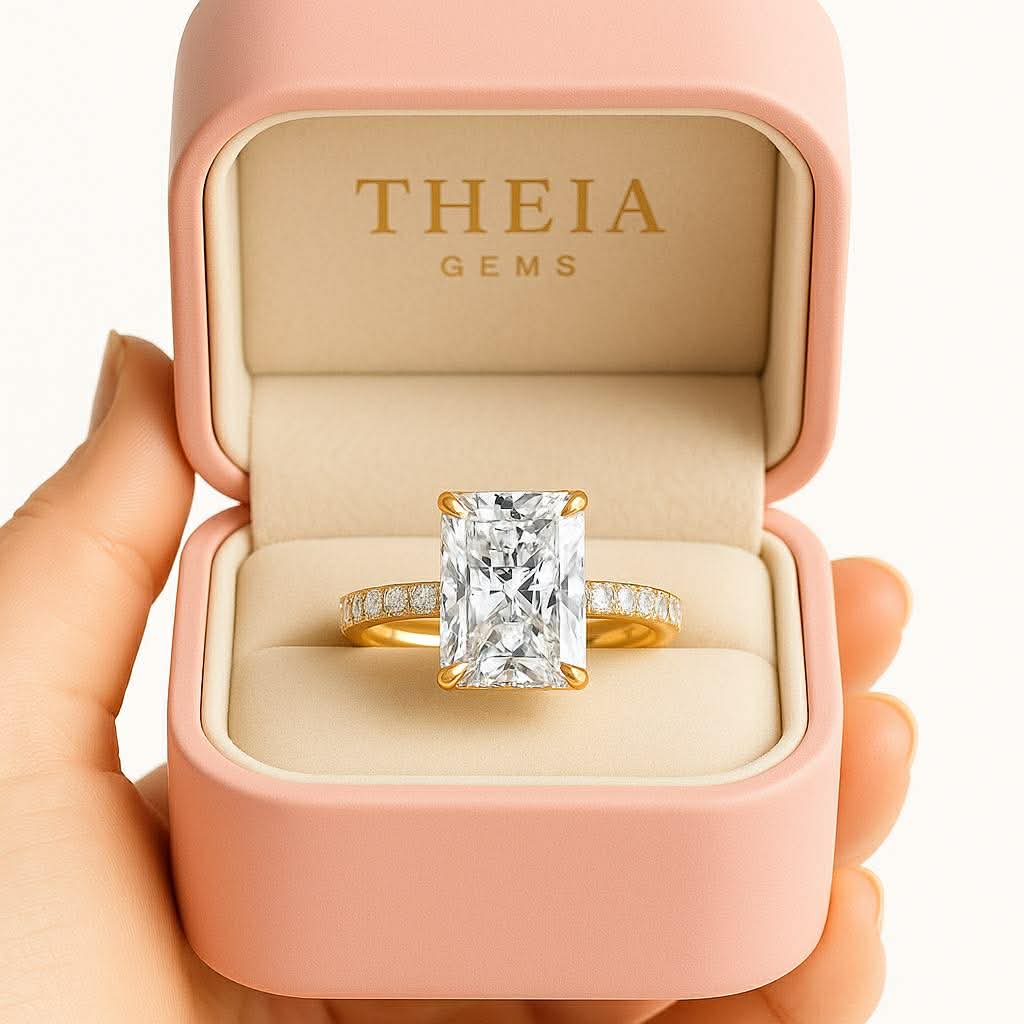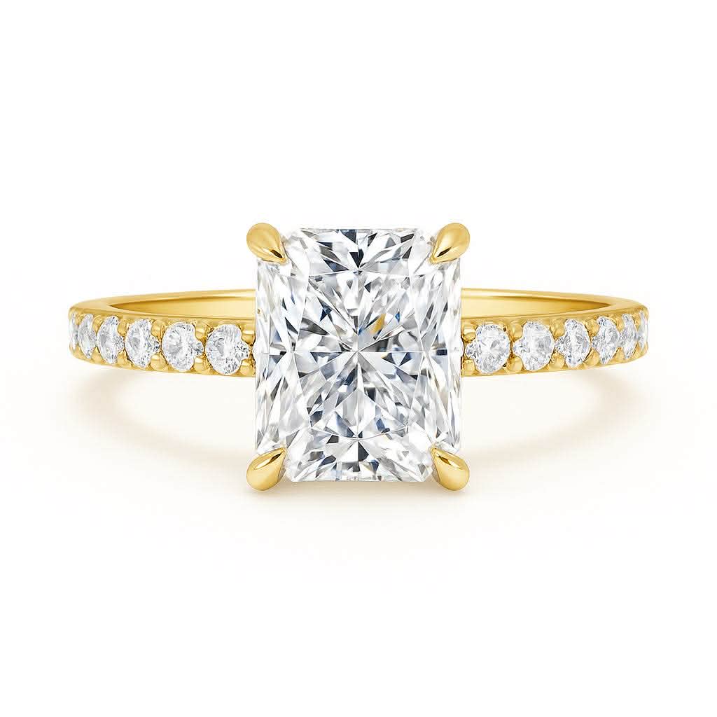 This delicate and stunning setting features a brilliant radiant cut lab-grown diamond crafted on an integrated 4-prong basket with petite prongs and a gallery wire. Made more beautiful with its equally brilliant pavé band.