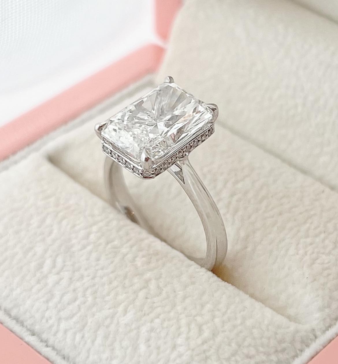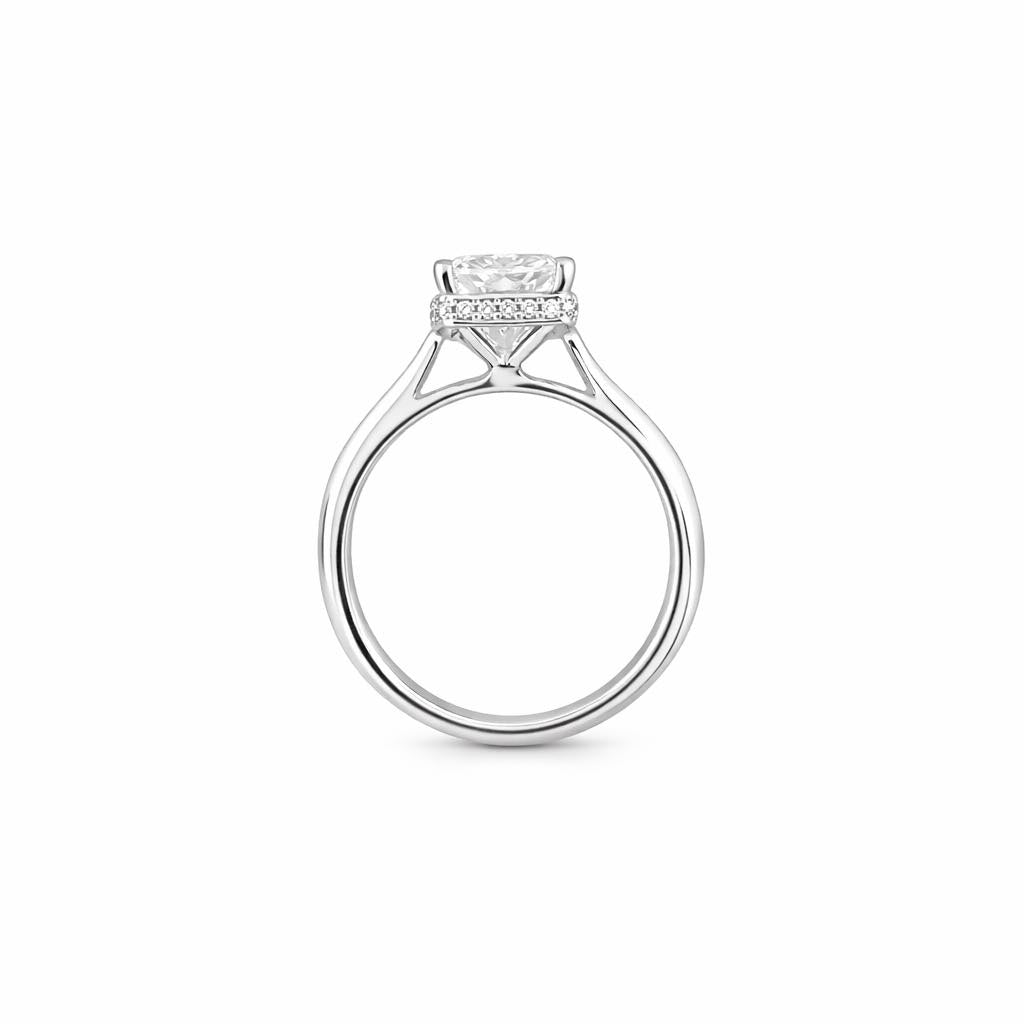 A classic design consisting of four square prongs with hidden halo on 18k gold setting.