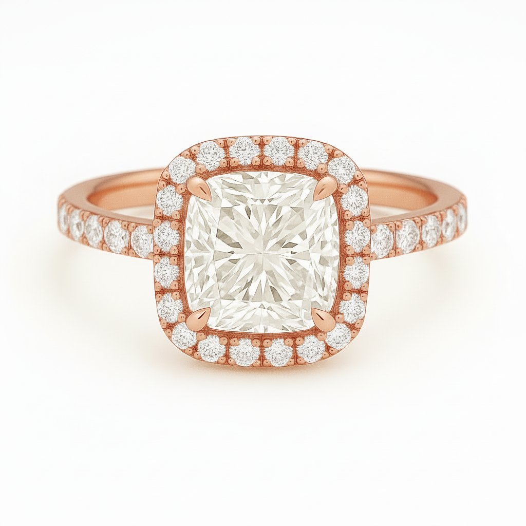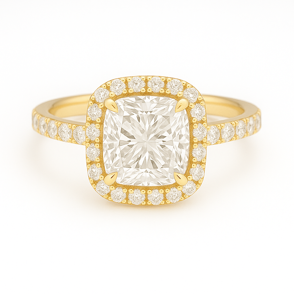 This setting features a single halo and cathedral shoulders. Made more stunning with its pavè band. Customize this by choosing your preferred carat size and gold tone.