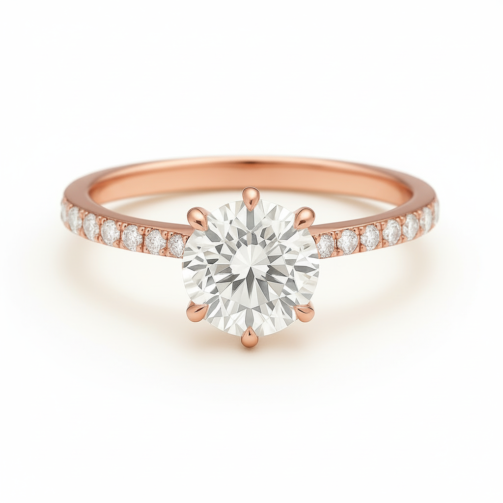 Available in a six or four prong basket, this gorgeous setting features a pavé diamond band with a hidden diamond collar. Customize LUNA with your desired carat size, metal tone and ring size.