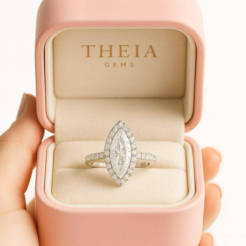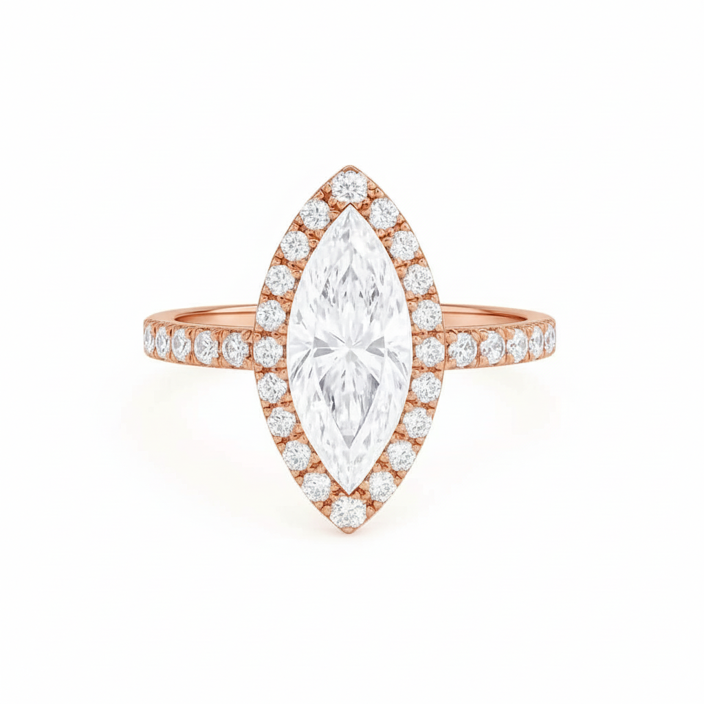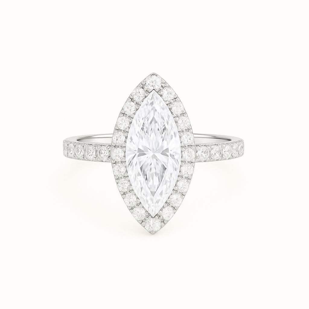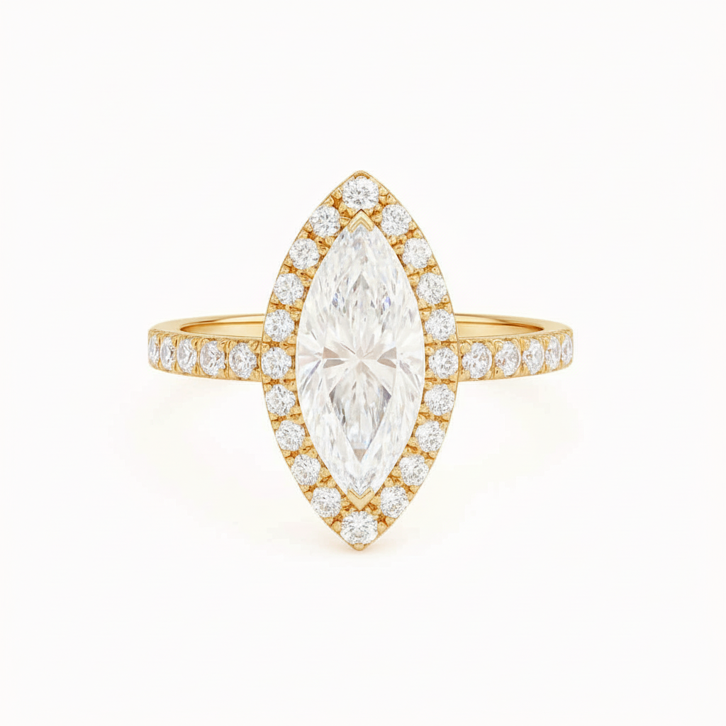 This setting features a single halo marquees diamond. Made more stunning with its pavè band. Customize this by choosing your preferred carat size and gold tone.