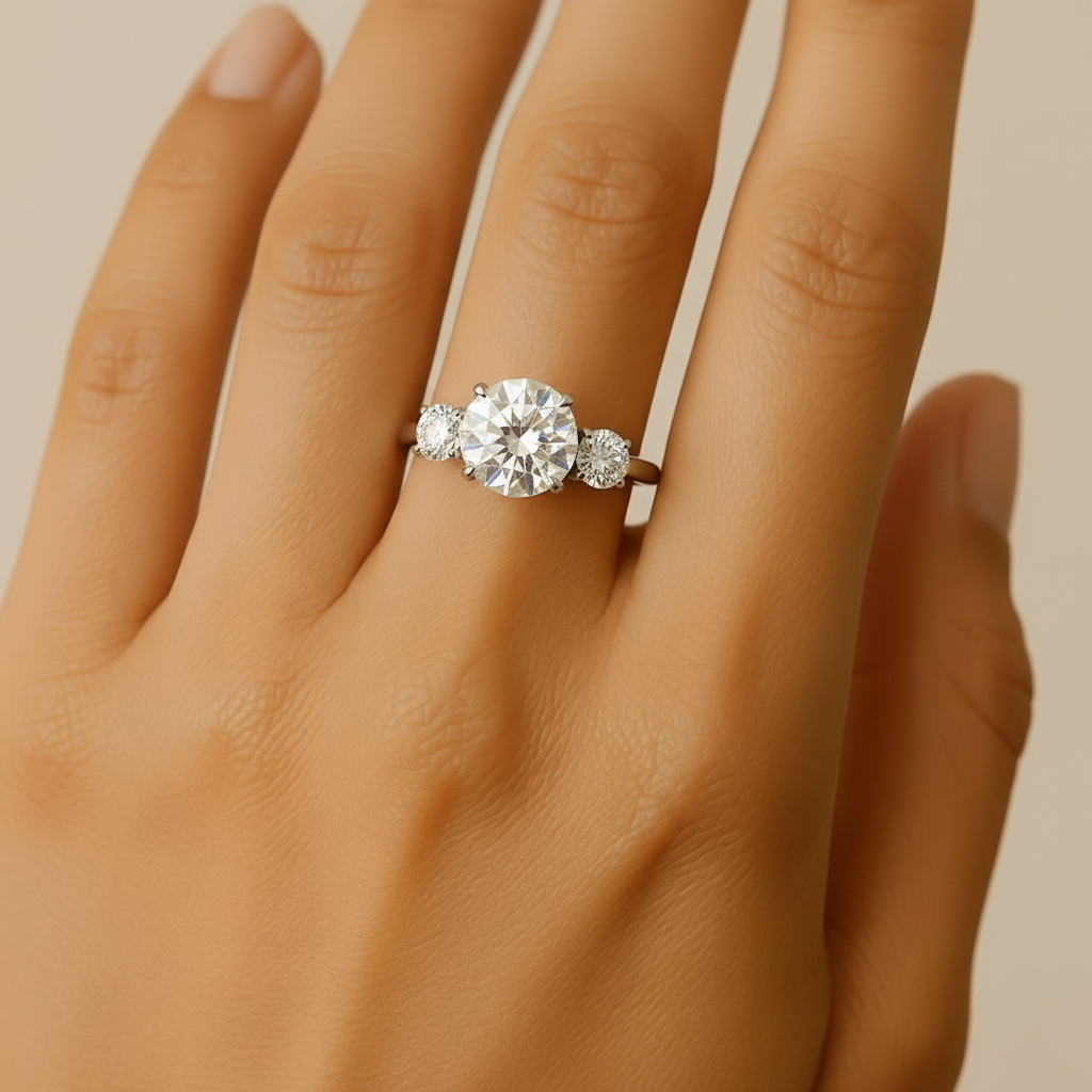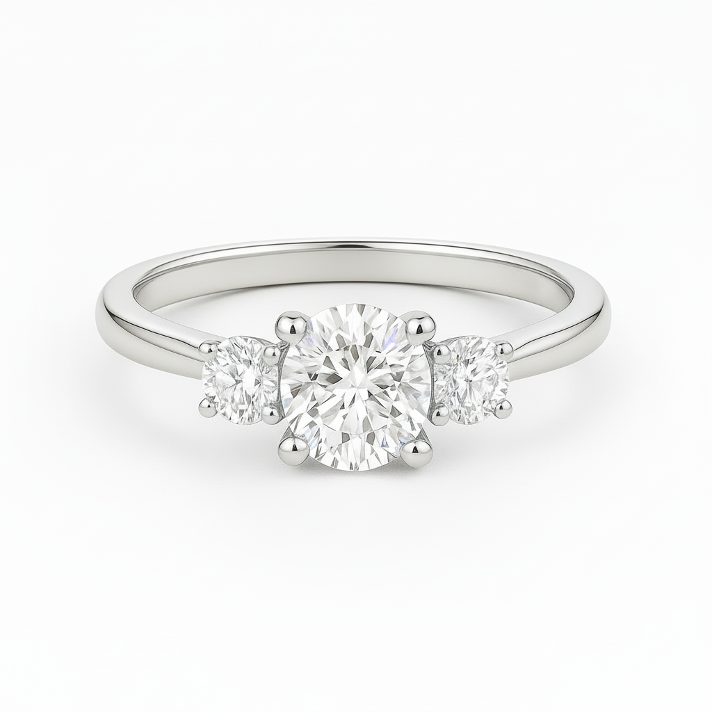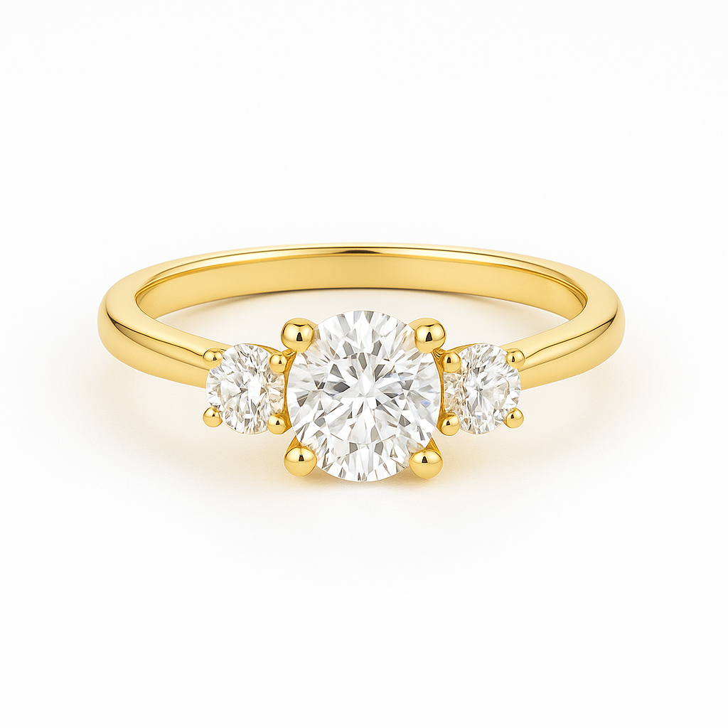 The TRINA engagement ring exemplifies timeless elegance with its sophisticated round trilogy design. This stunning piece features a luminous round center stone flanked by complementary accent diamonds, creating a harmonious composition that enhances the main stone's brilliance.