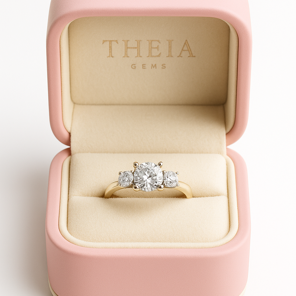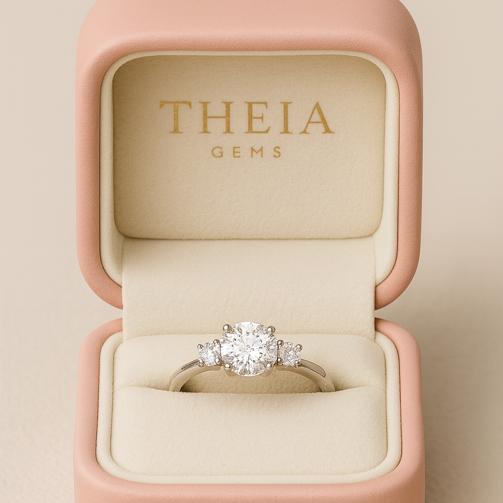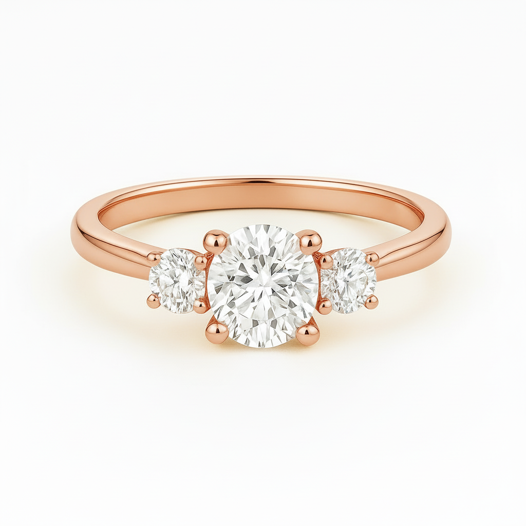The TRINA engagement ring exemplifies timeless elegance with its sophisticated round trilogy design. This stunning piece features a luminous round center stone flanked by complementary accent diamonds, creating a harmonious composition that enhances the main stone's brilliance.