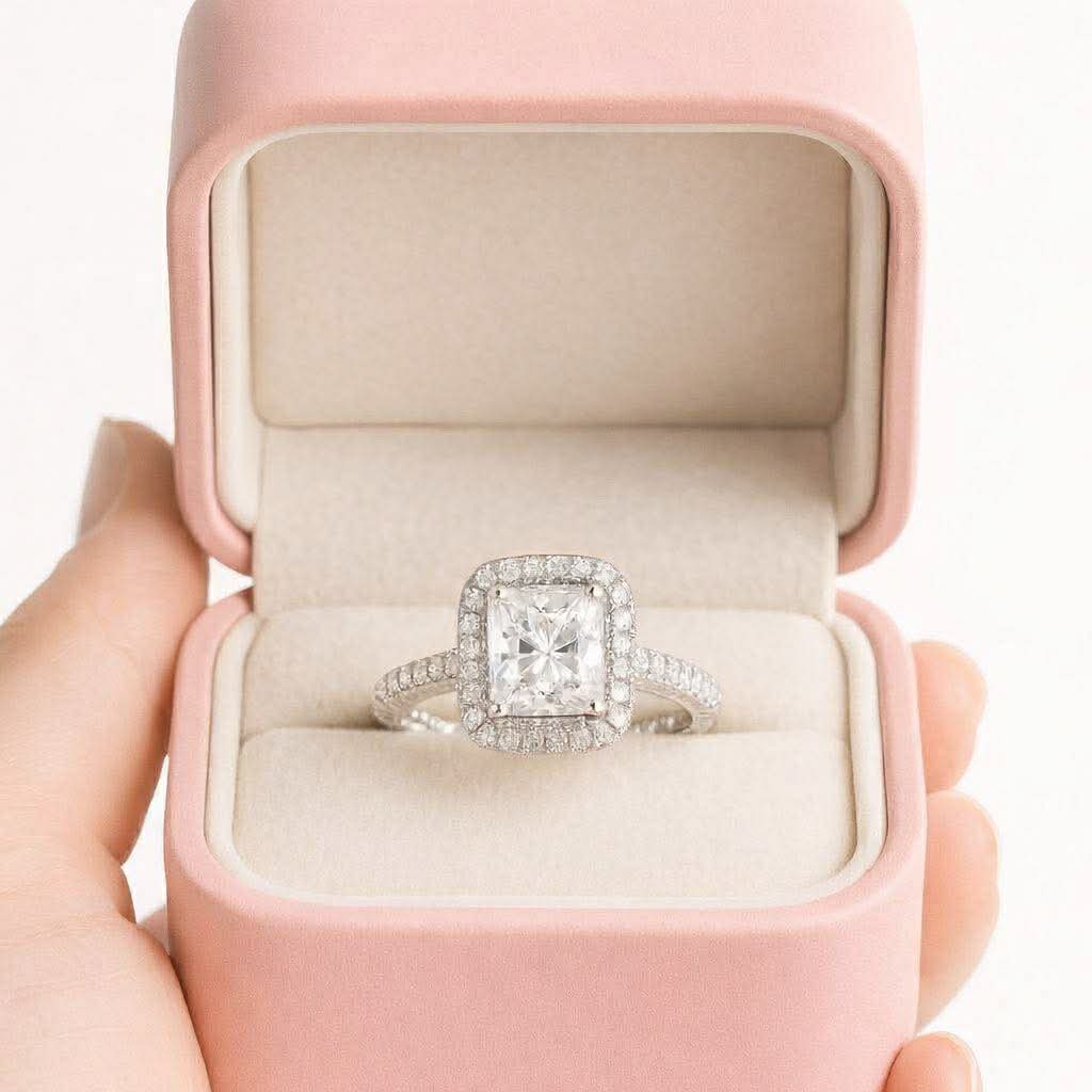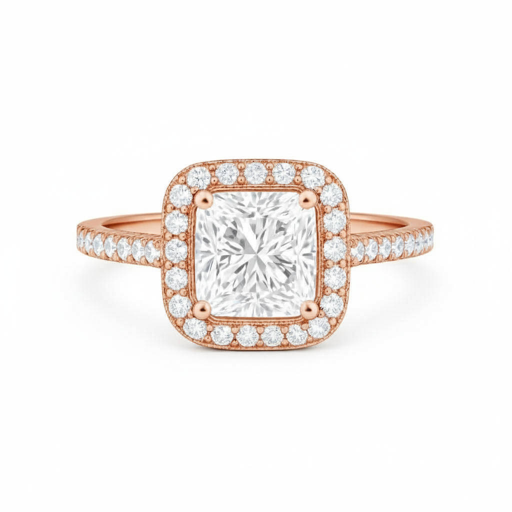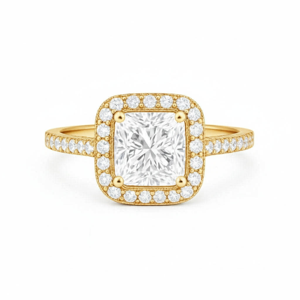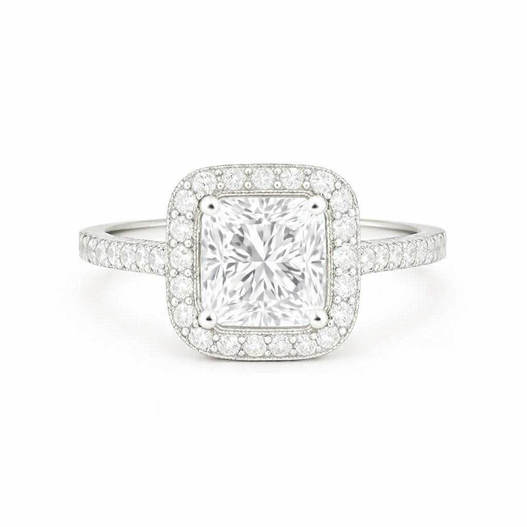 A classic halo design featuring a brilliant princess cut diamond accented with smaller diamonds surrounding the center stone and on each side of the band or you can have it customized in double pavé band too!