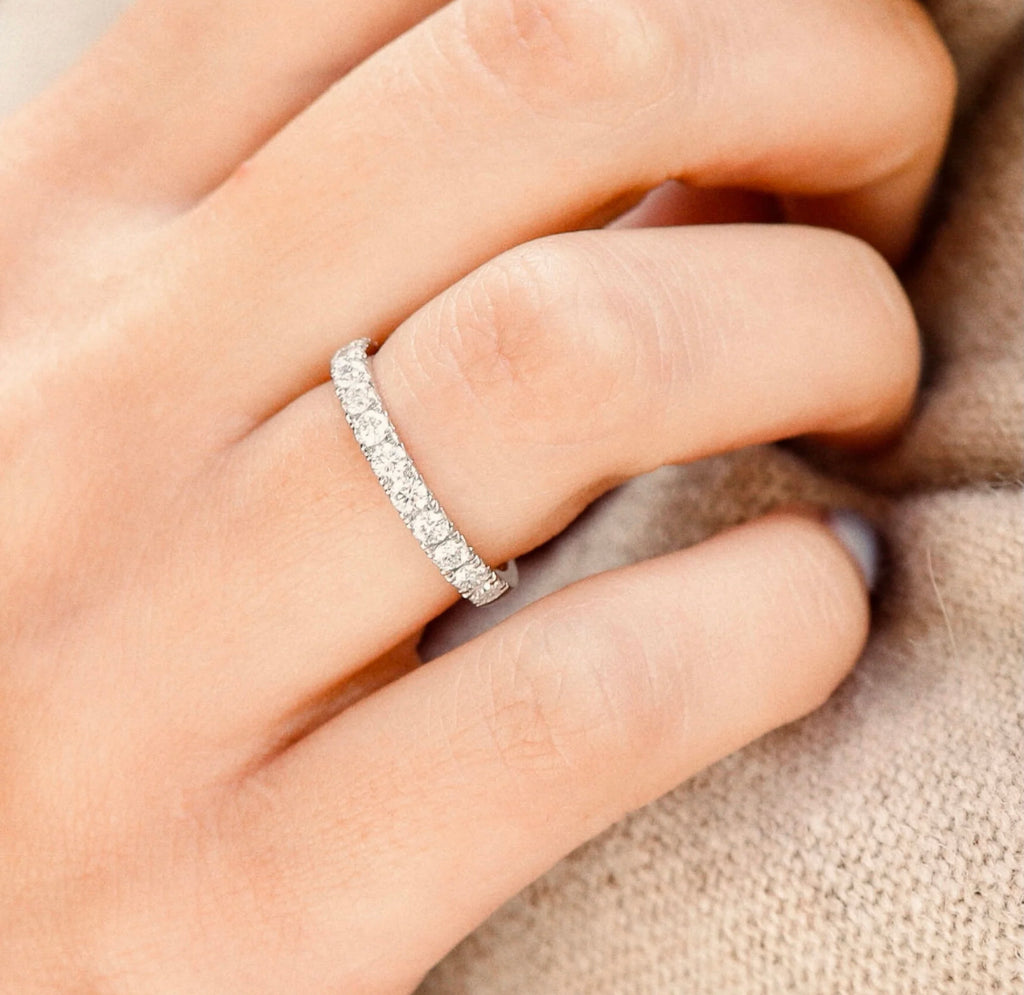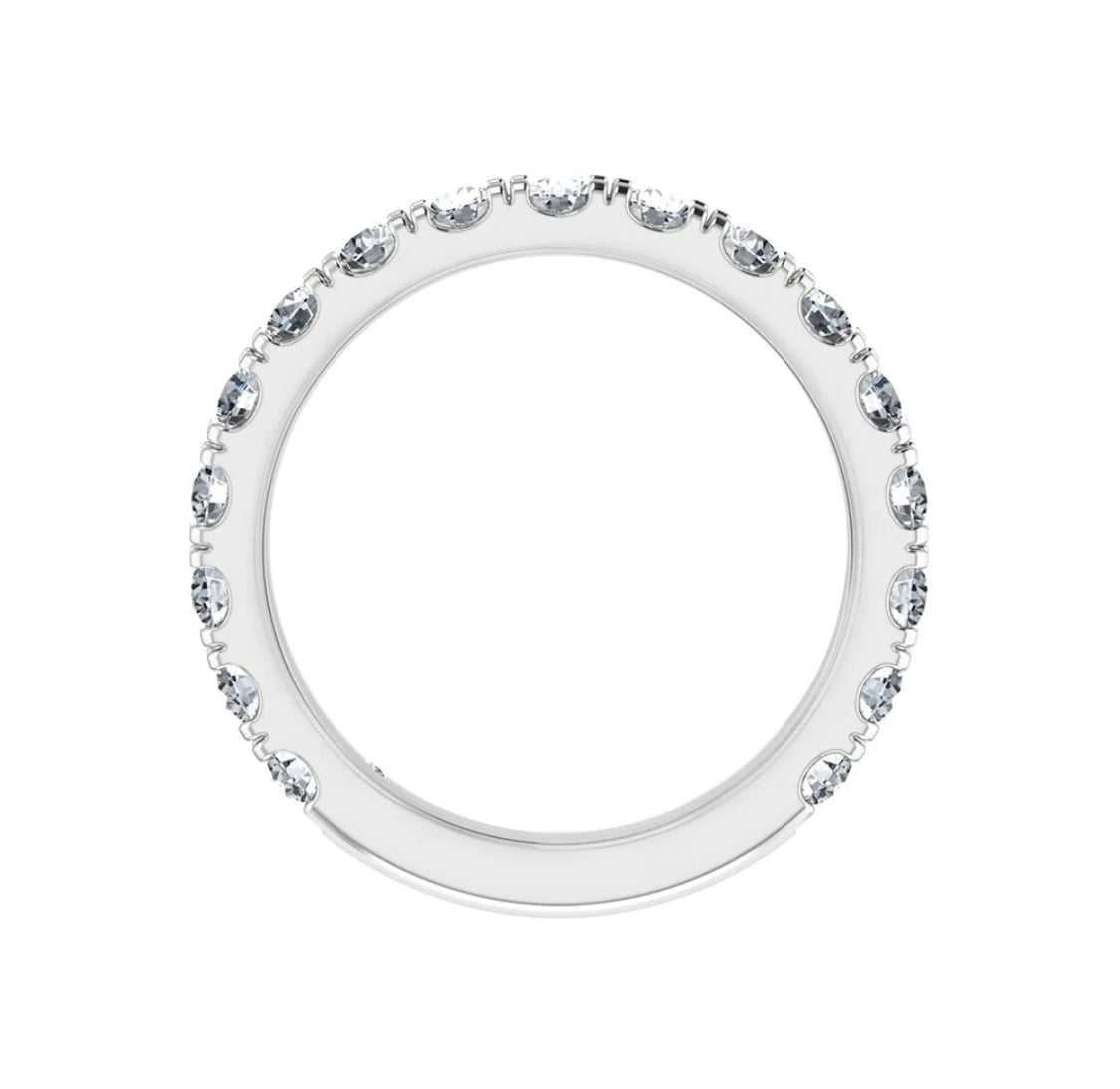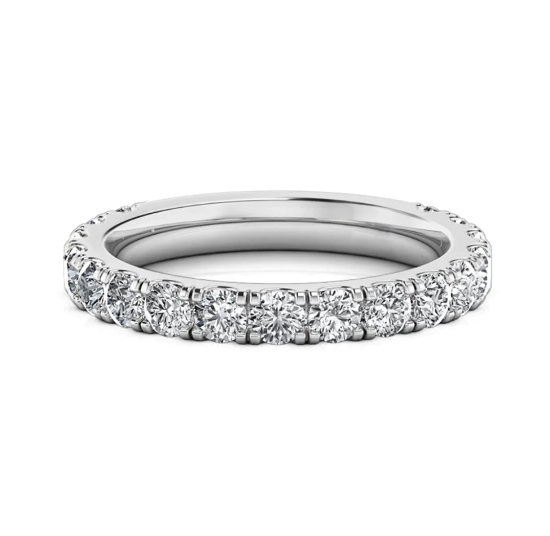 A classic, 18k white gold eternity ring design that consists of a 2.7mm shank with micropavé set diamonds. You can have it in yellow gold setting too!