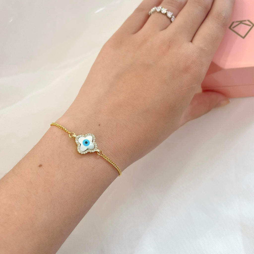 DISCLAIMER:The bracelet itself is solid 18k gold, the evil eye is stainless gold plated.you can take a bath with it but avoid spraying alcohol and perfume on the evil eye.