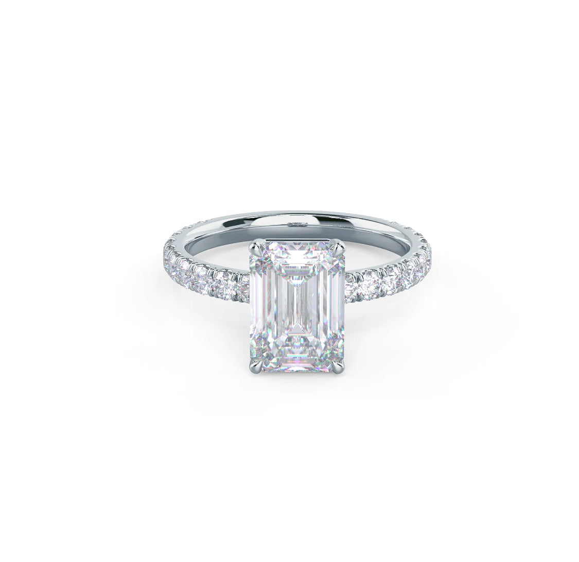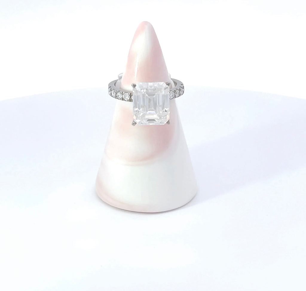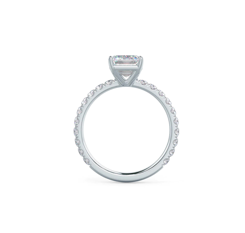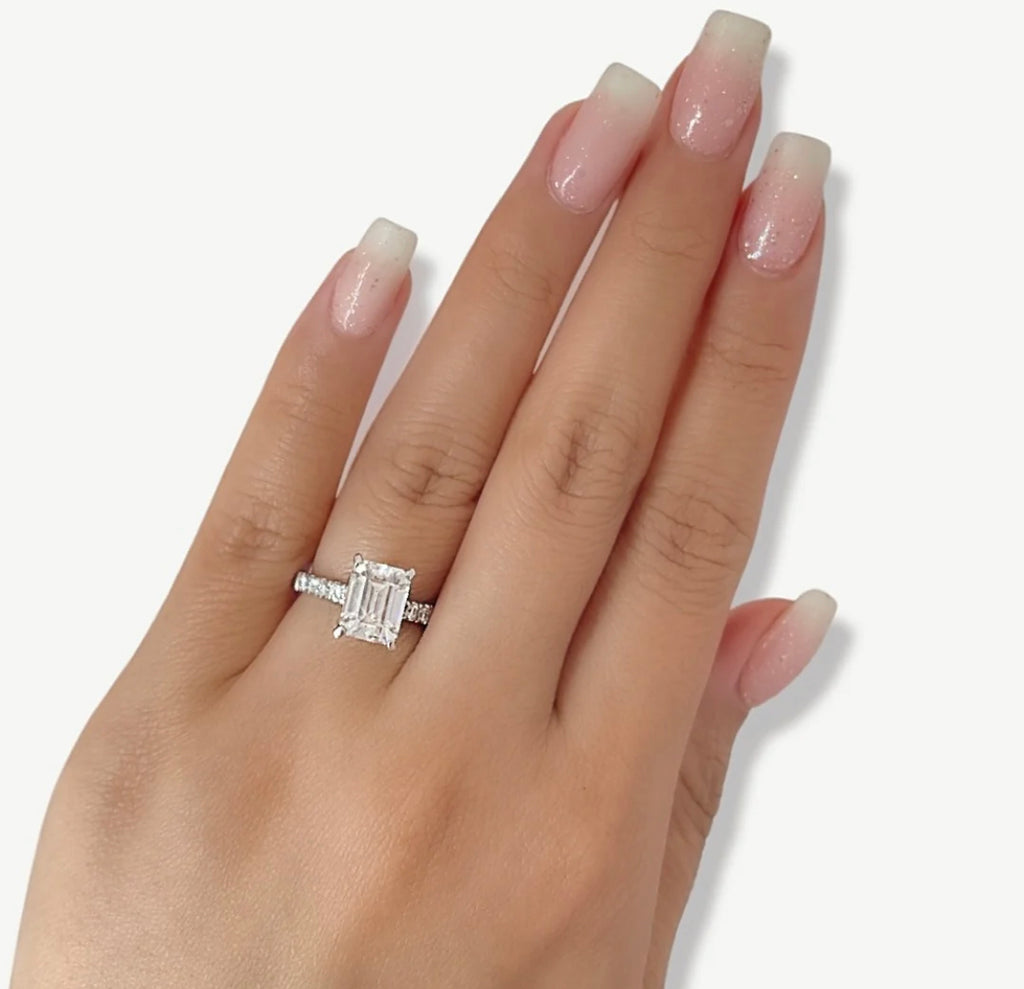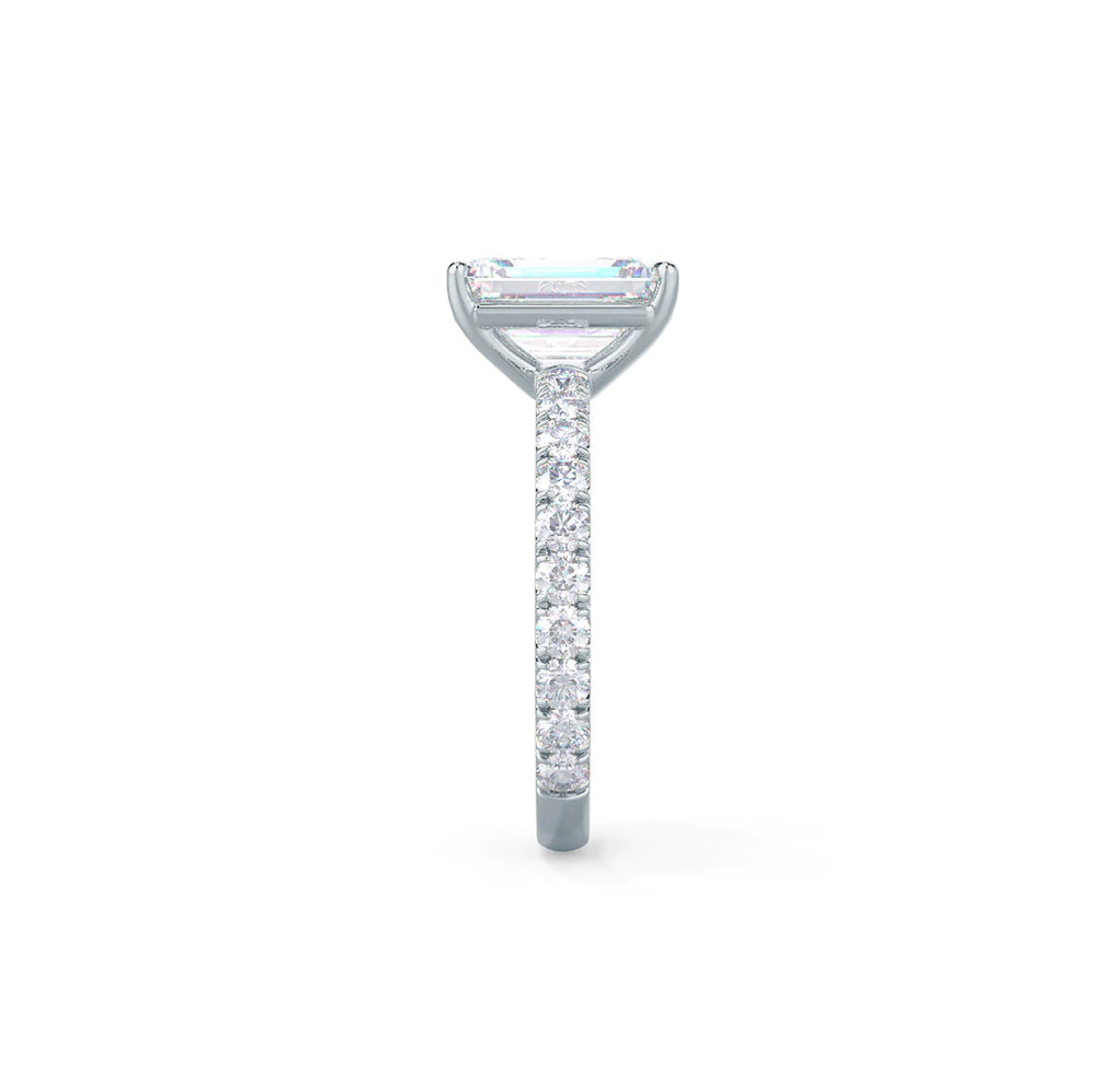 HEBE features a brilliant Emerald cut on four prong house with equally brilliant diamonds on each side of the band.