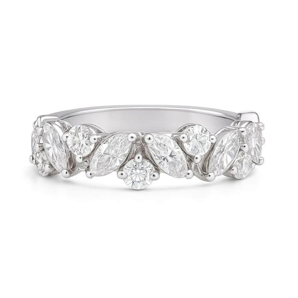 A classic, 18 carat white gold or yellow gold eternity ring design that consists of marquise and round diamonds cut.