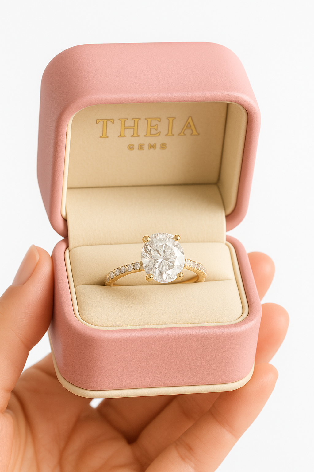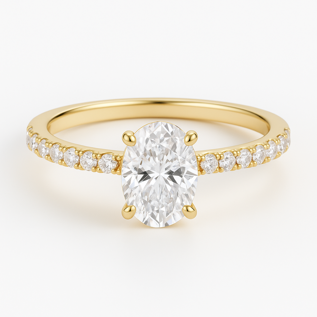This delicate and stunning setting features a brilliant oval cut lab-grown diamond crafted on an integrated 4-prong basket with petite prongs and a gallery wire. Made more beautiful with its equally brilliant pavé band.
