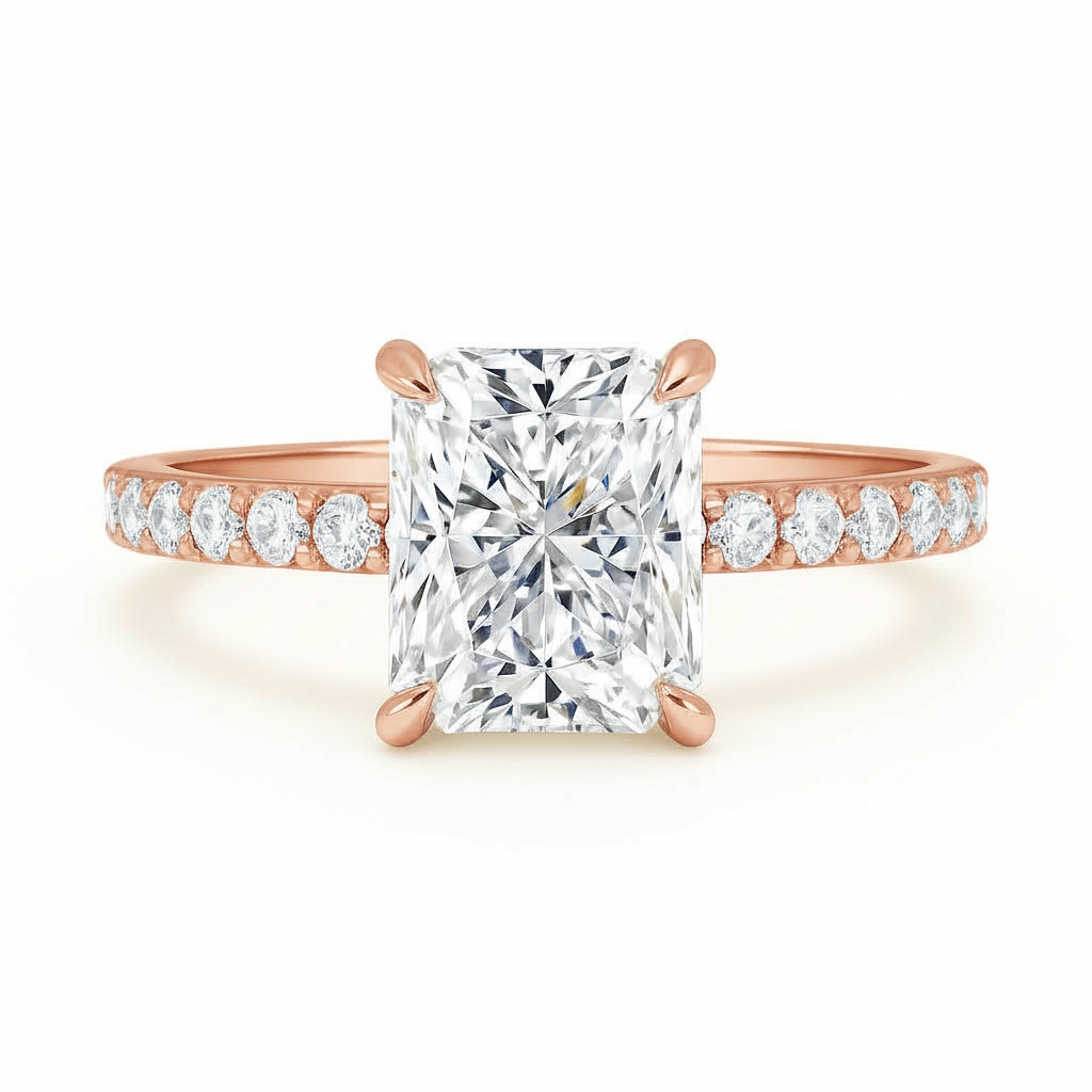 This delicate and stunning setting features a brilliant radiant cut lab-grown diamond crafted on an integrated 4-prong basket with petite prongs and a gallery wire. Made more beautiful with its equally brilliant pavé band.