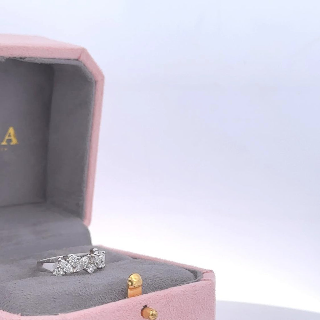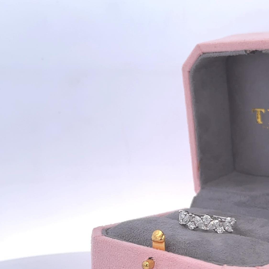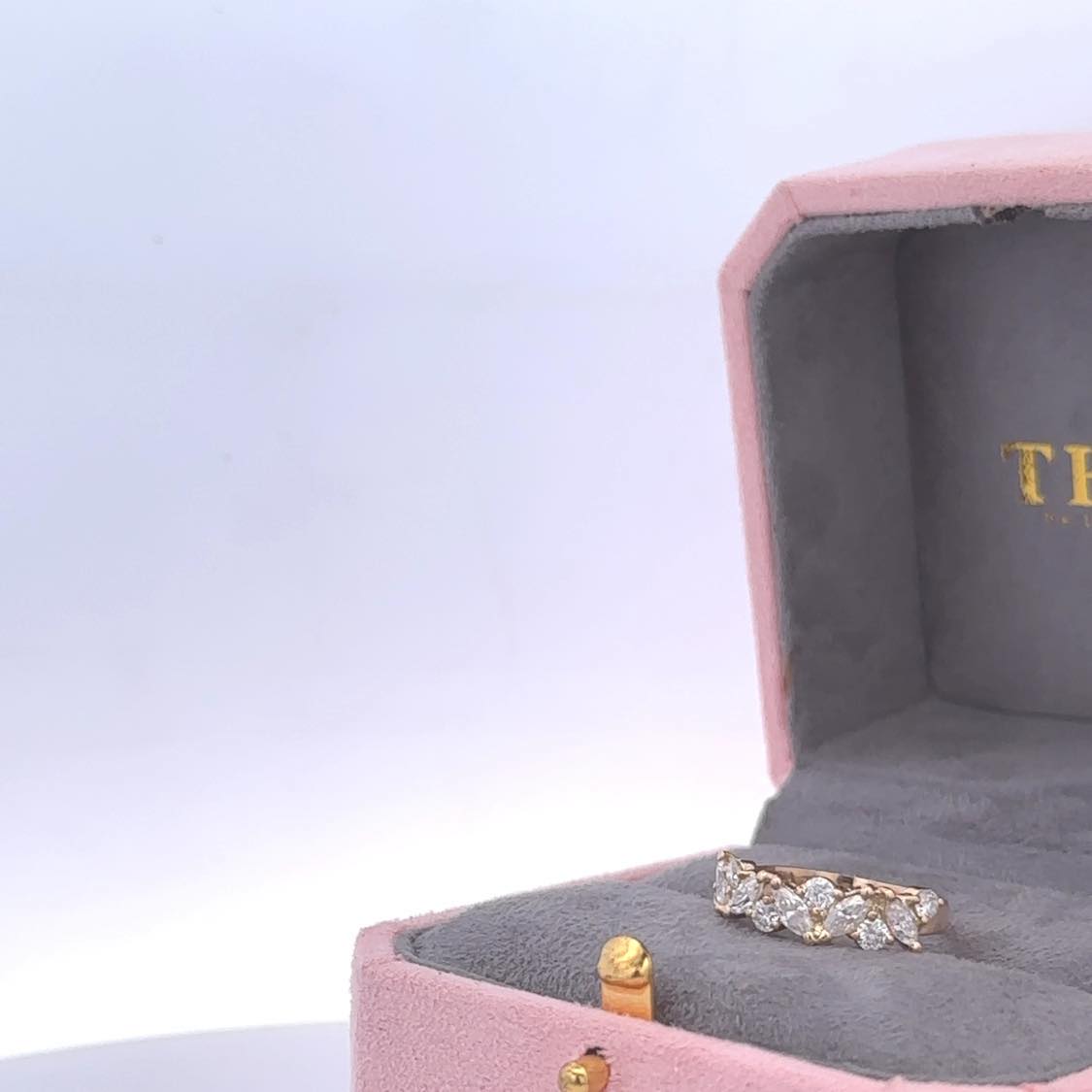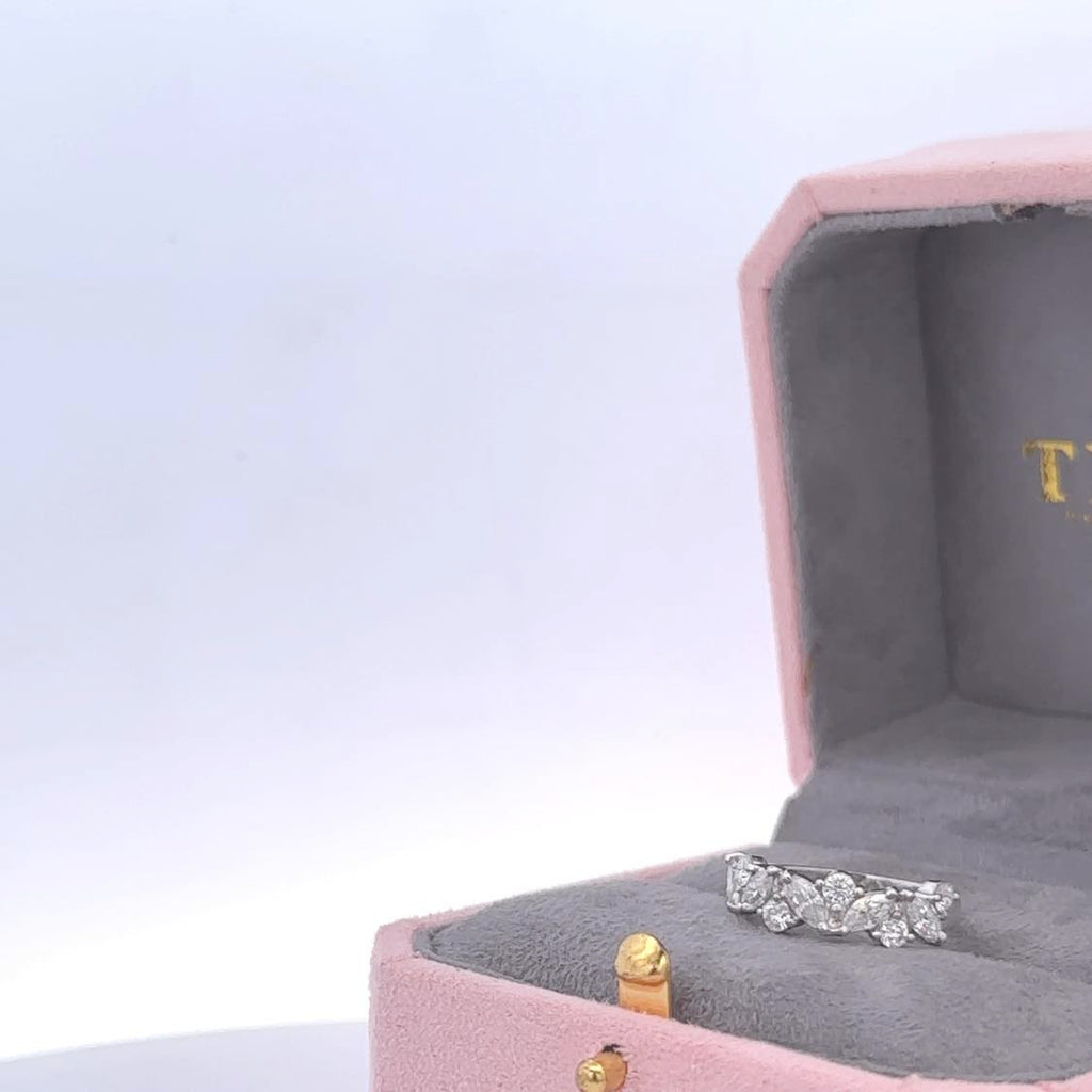 A classic, 18 carat white gold or yellow gold eternity ring design that consists of marquise and round diamonds cut.