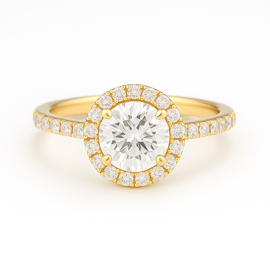 Classic halo setting featuring a brilliant round cut center lab-grown diamond circled with equally brilliant accent titus diamonds crafted on a pavé 18k gold band. Customize ALYSSA with your desired carat size, metal tone and ring size.