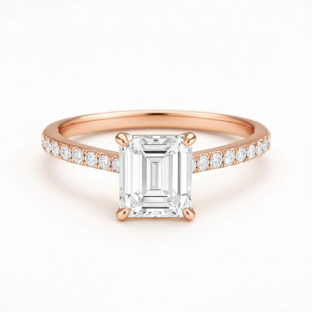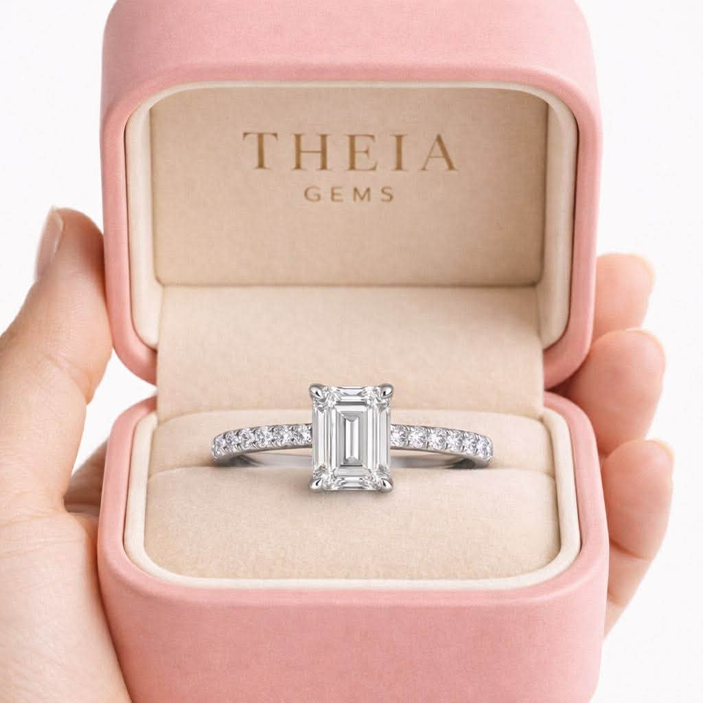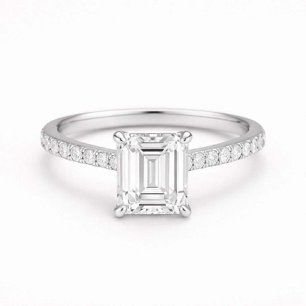 HEBE features a brilliant Emerald cut on four prong house with equally brilliant diamonds on each side of the band.
