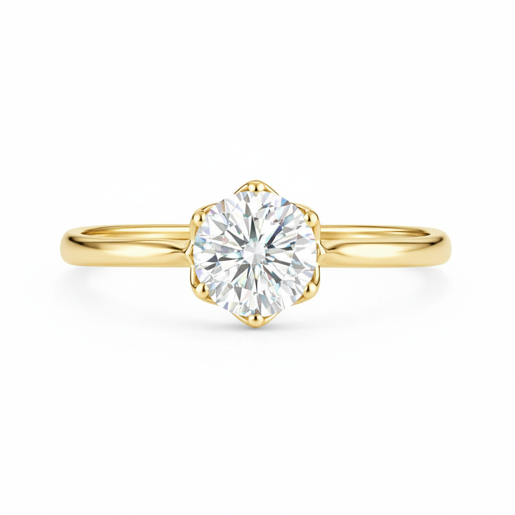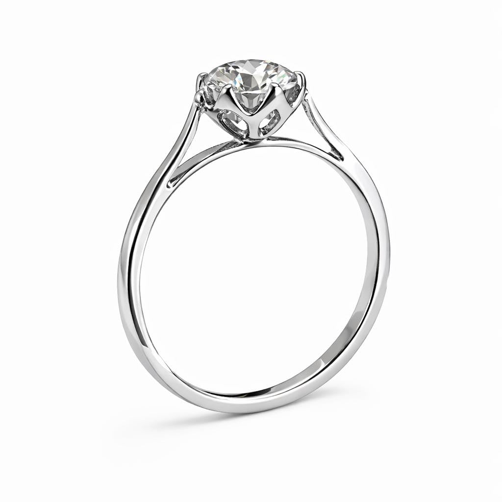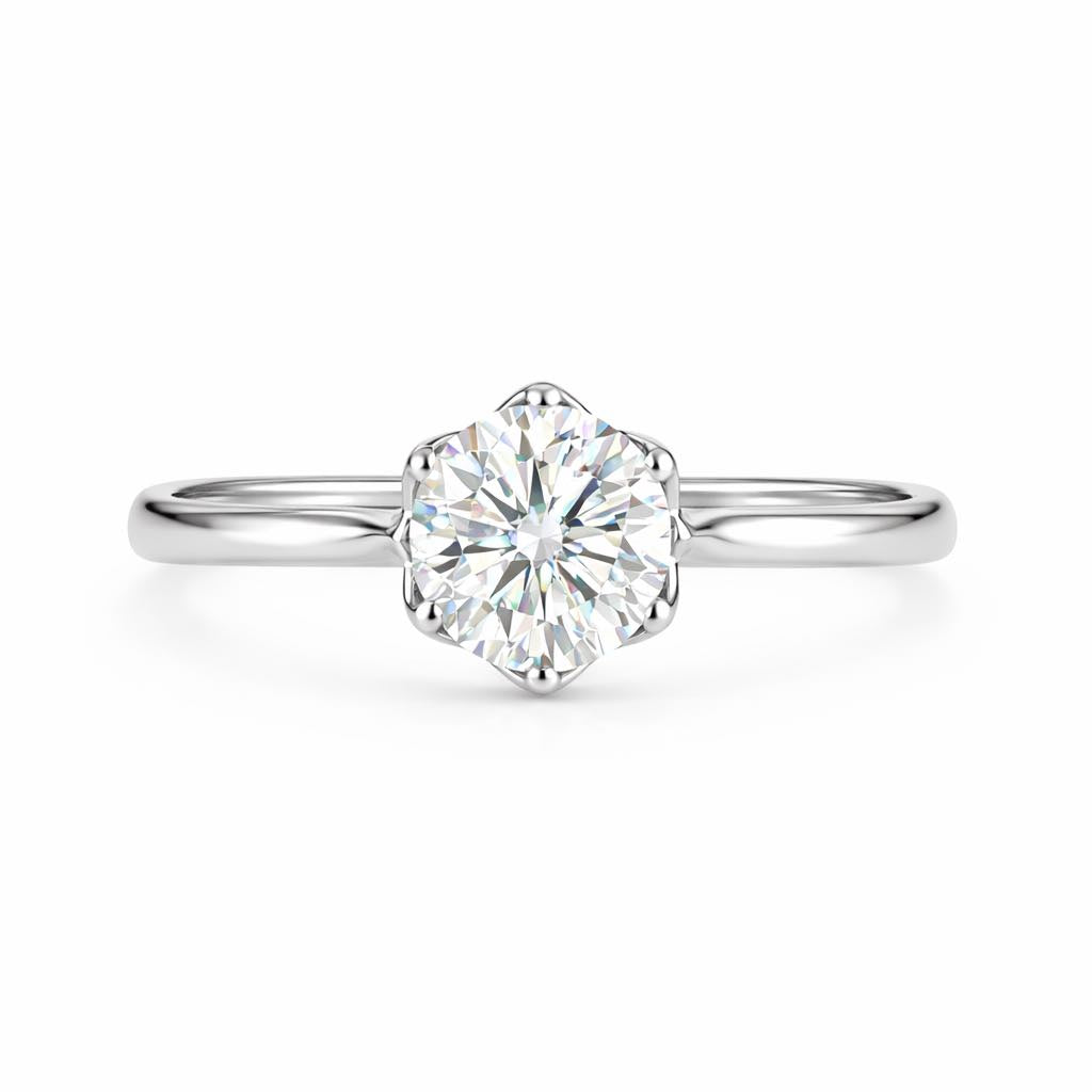 A sophisticated classic solitaire diamond ring that consists of a petite tapered plain shank with a four or six prong setting with petal prongs design and a pointed prong finish.