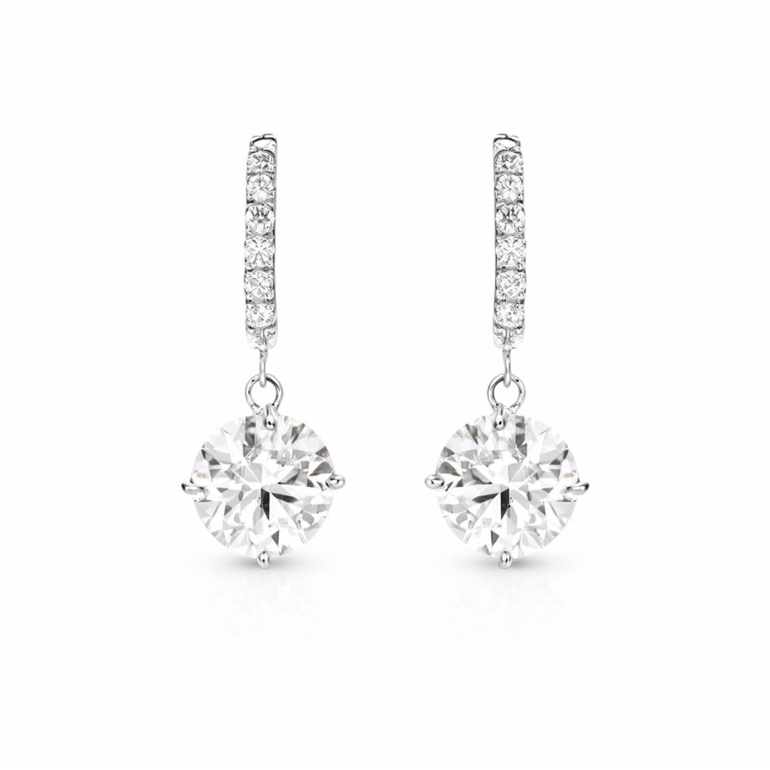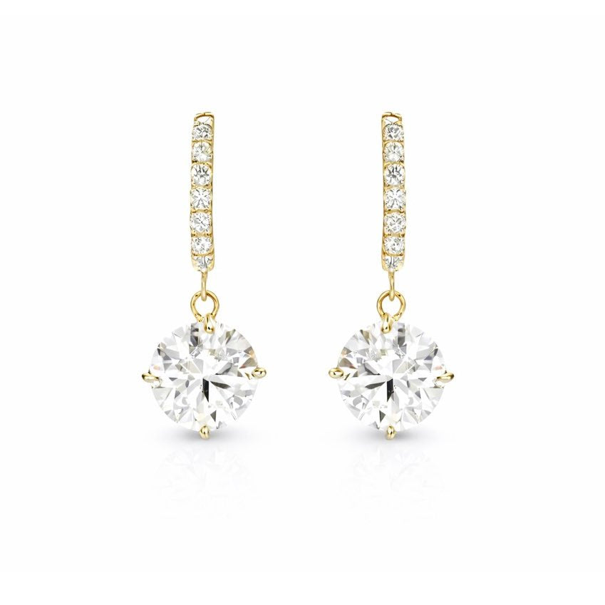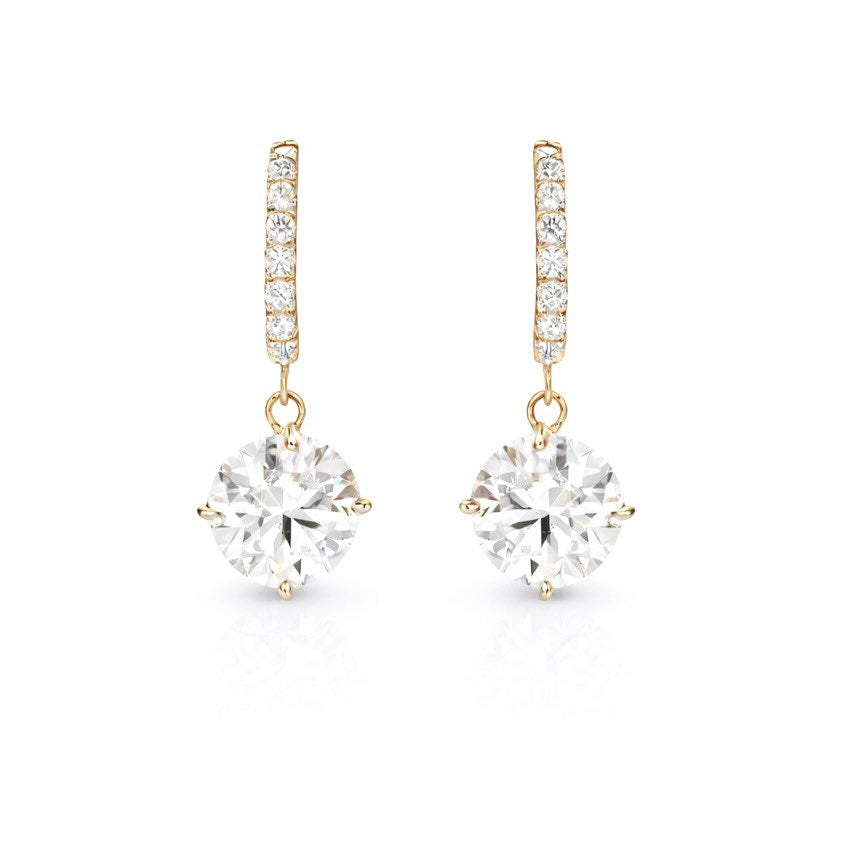 Simple and Classic. Matching round-shaped diamonds in 18k white, yellow or rose gold four to six prong baskets.
