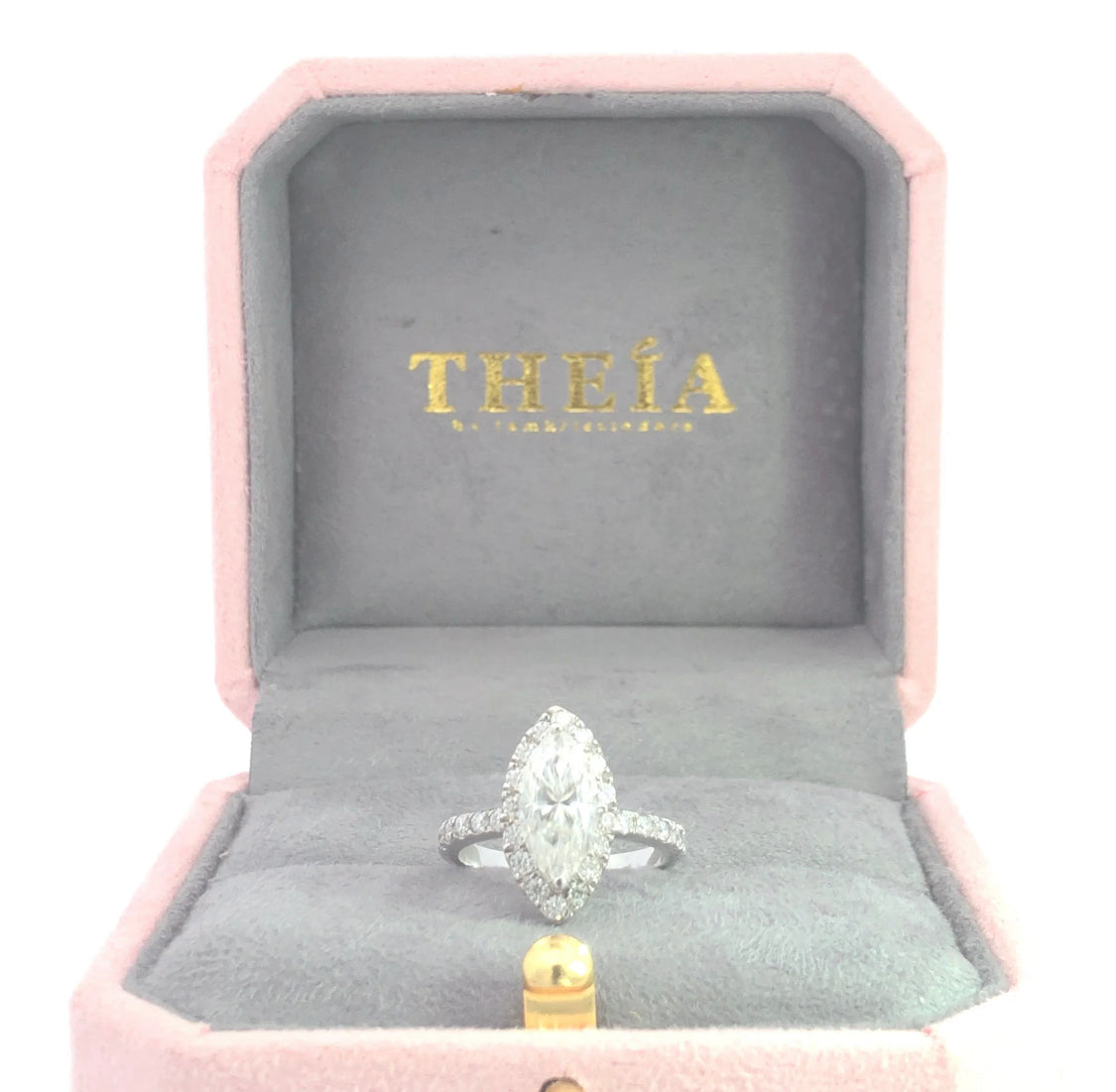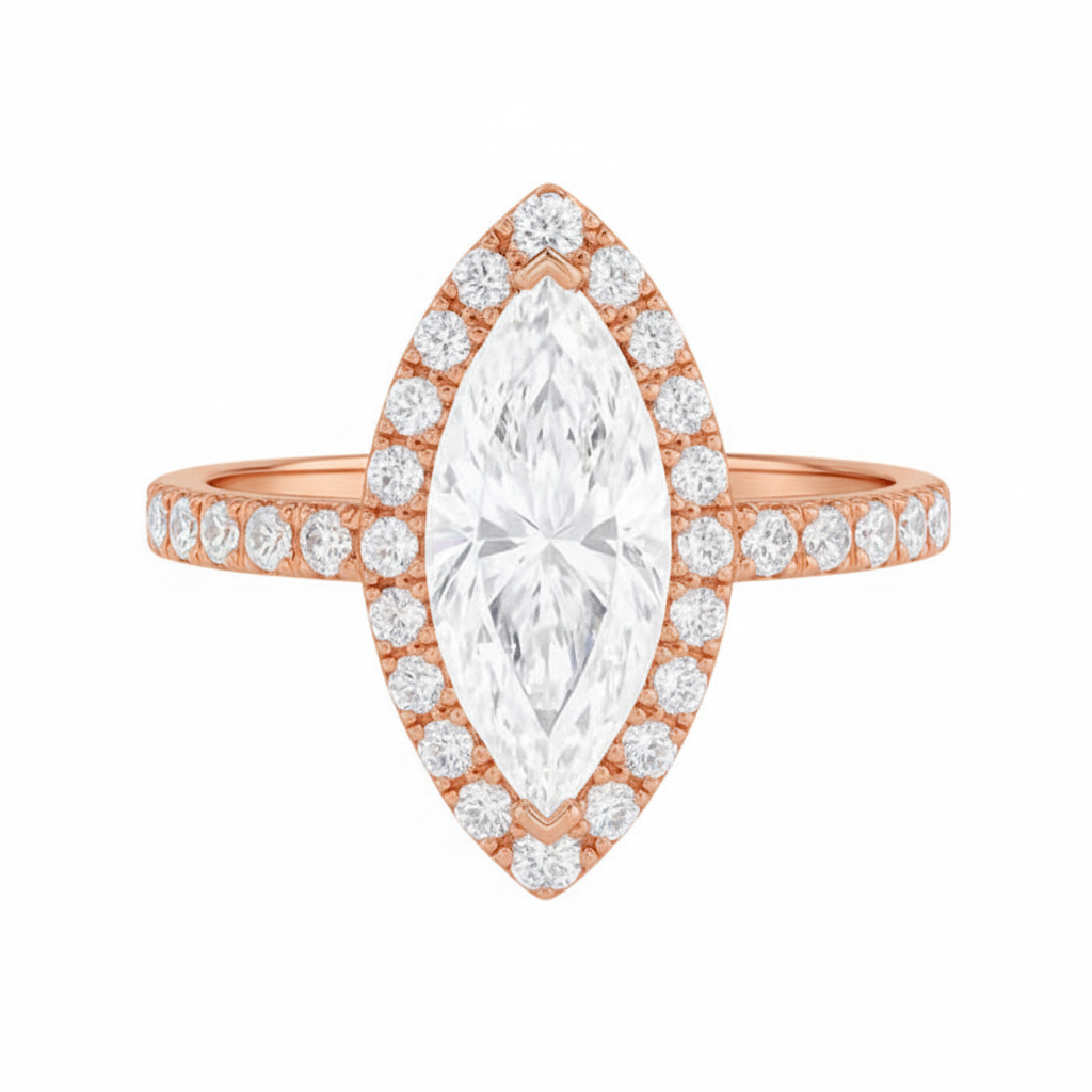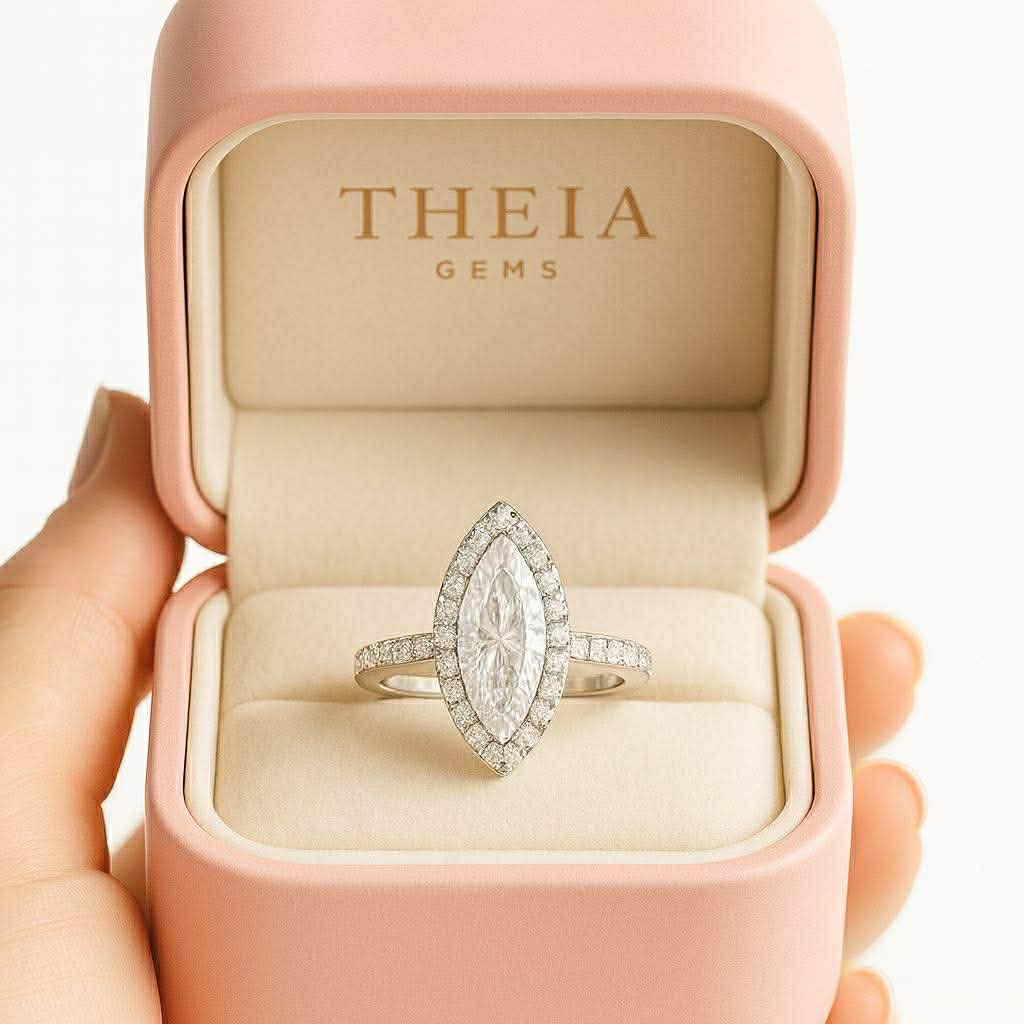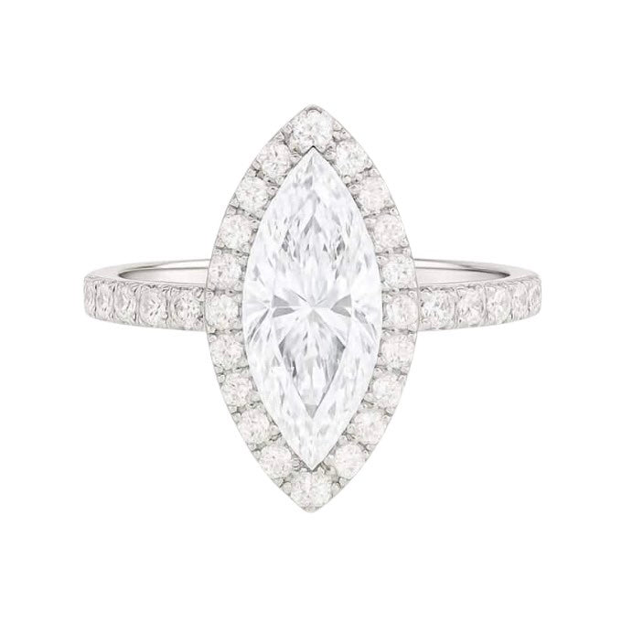 This setting features a single halo marquise moissanite stone. Made more stunning with its pavè band.