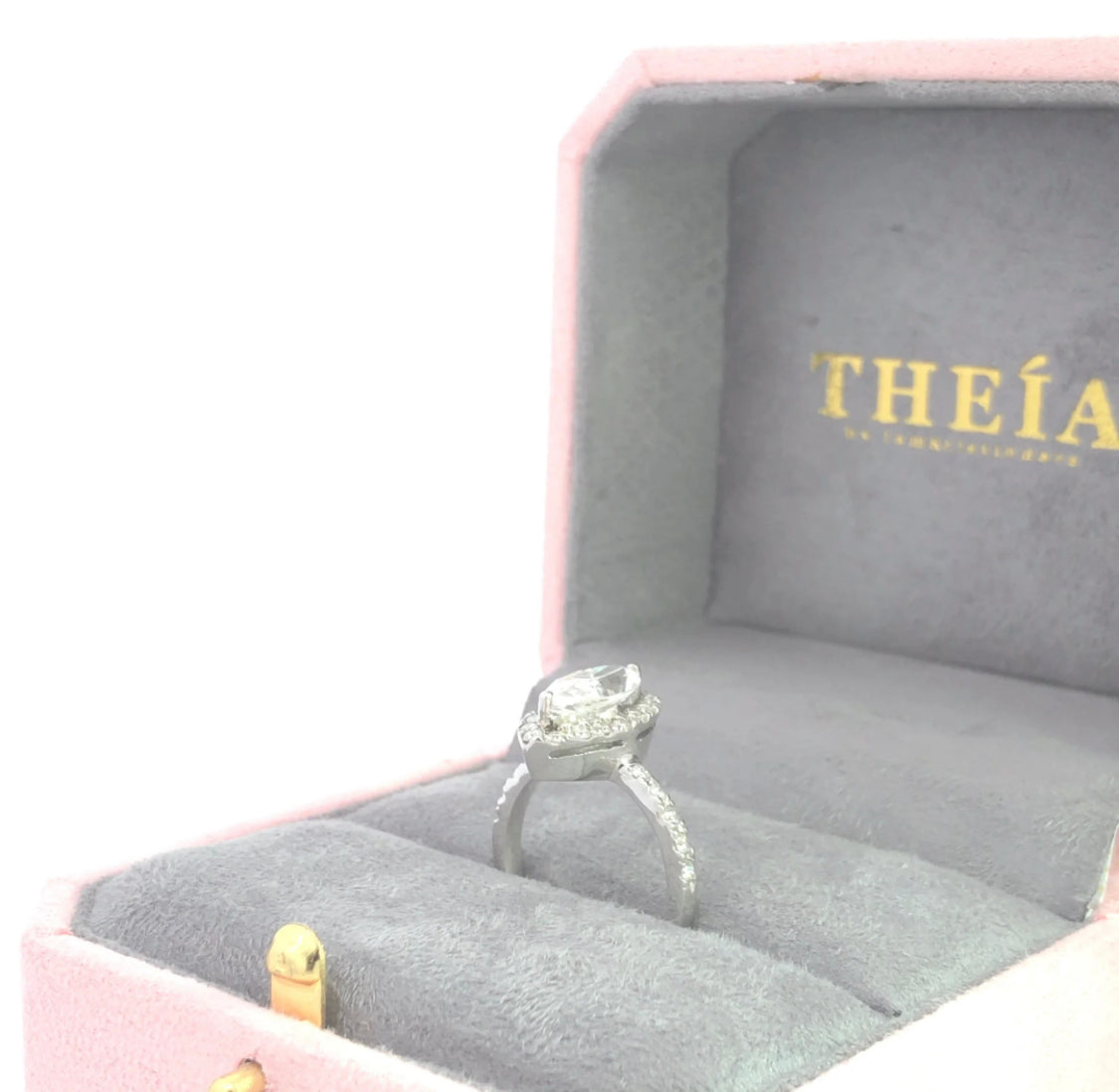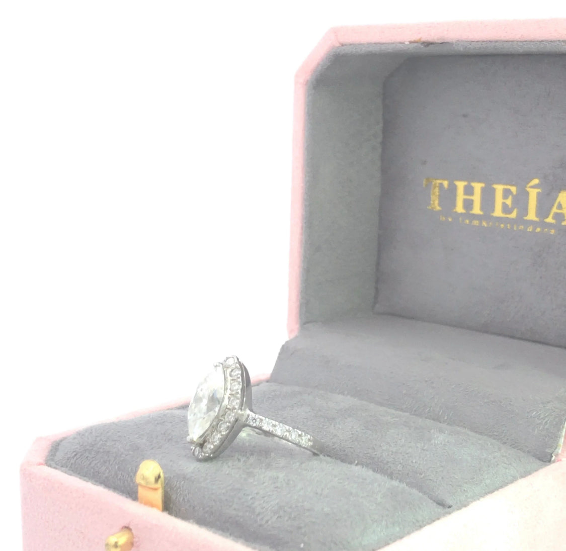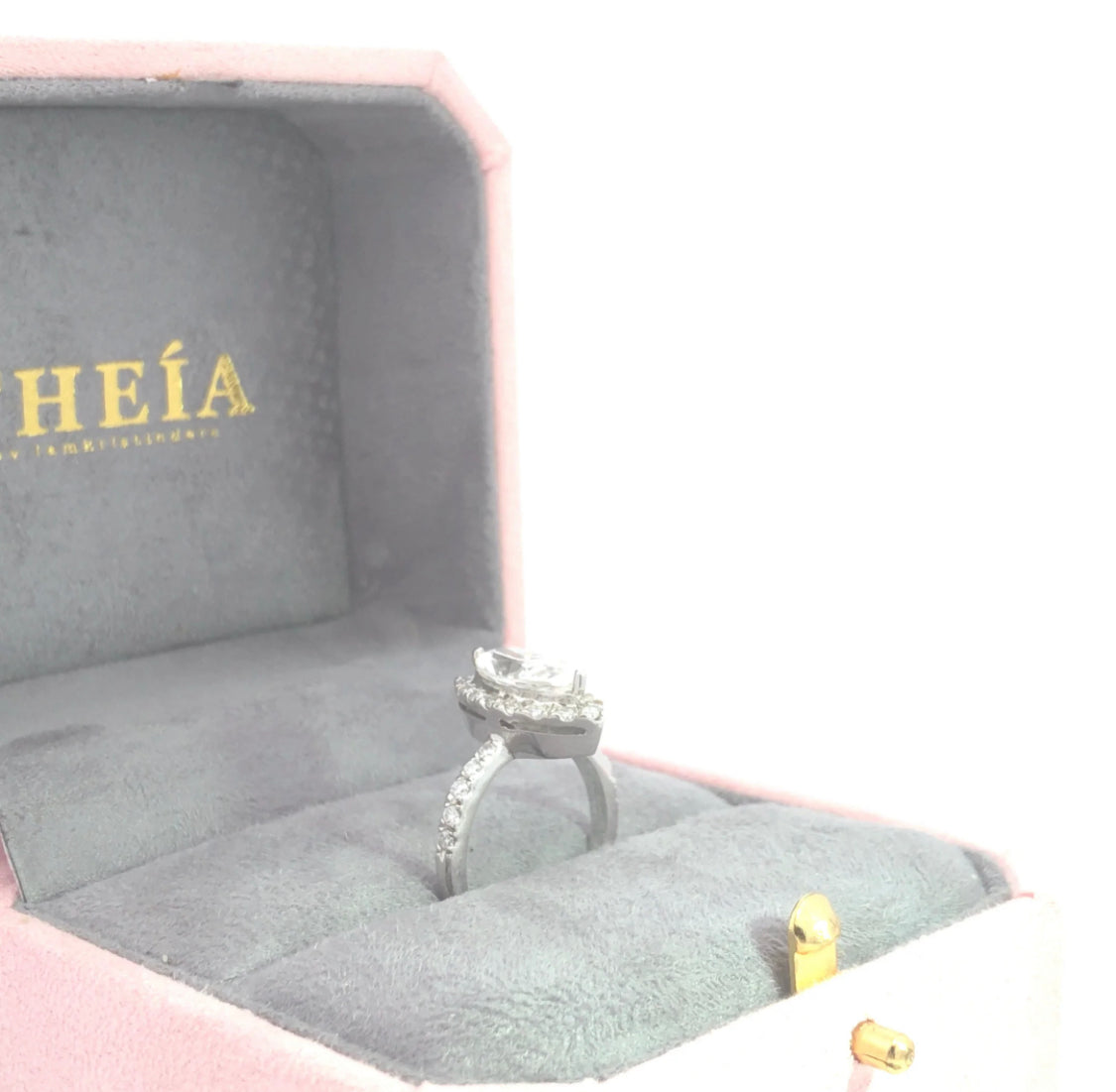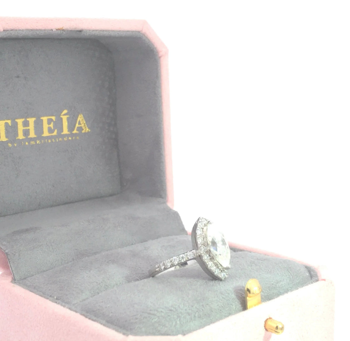 This setting features a single halo marquise moissanite stone. Made more stunning with its pavè band.