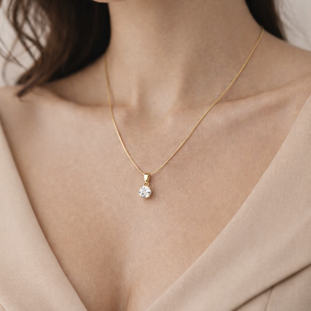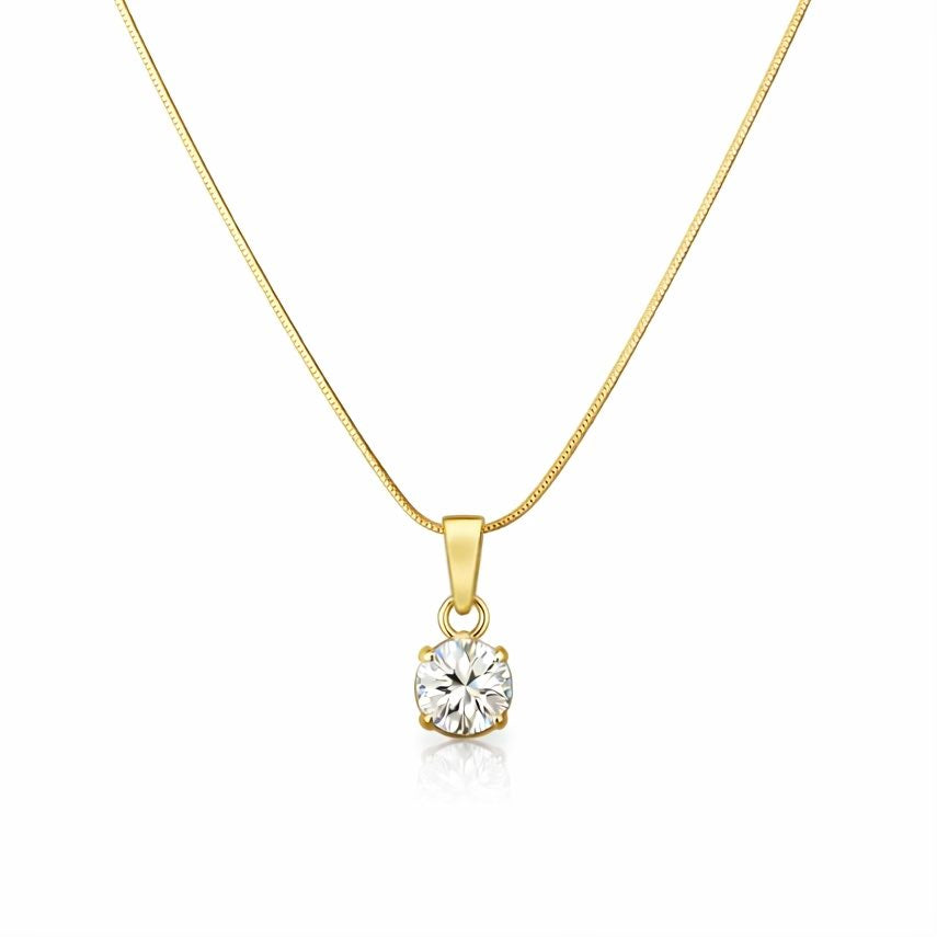 A classic brilliant round cut pendant, crafted in 18k Yellow Gold. Paired with an 18 inch 18k Yellow Gold omega flat chain.