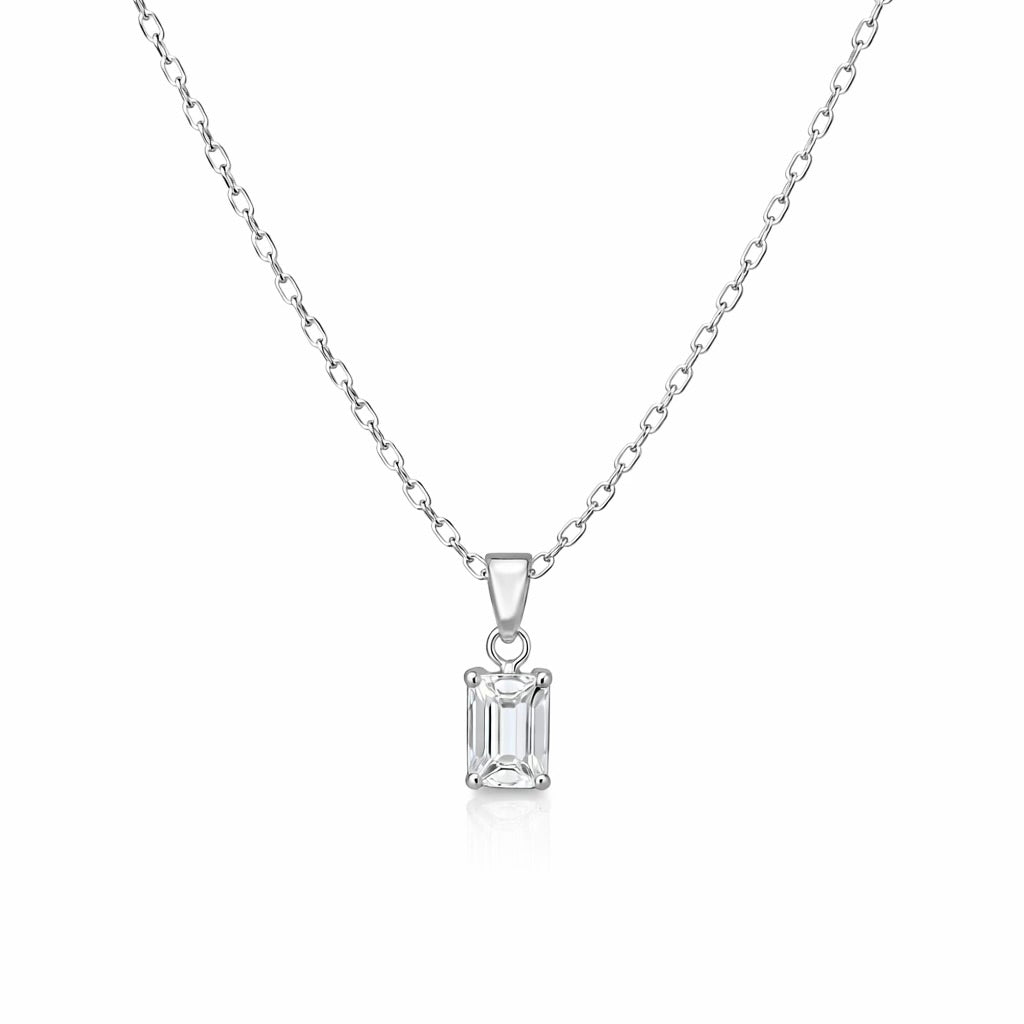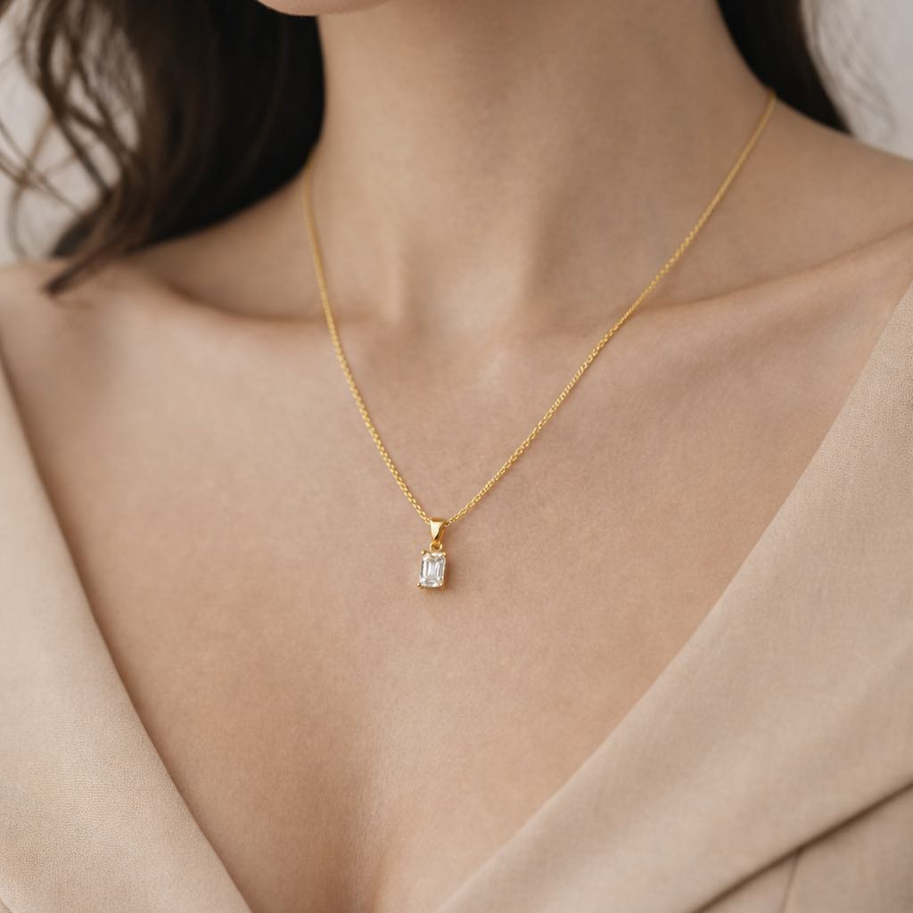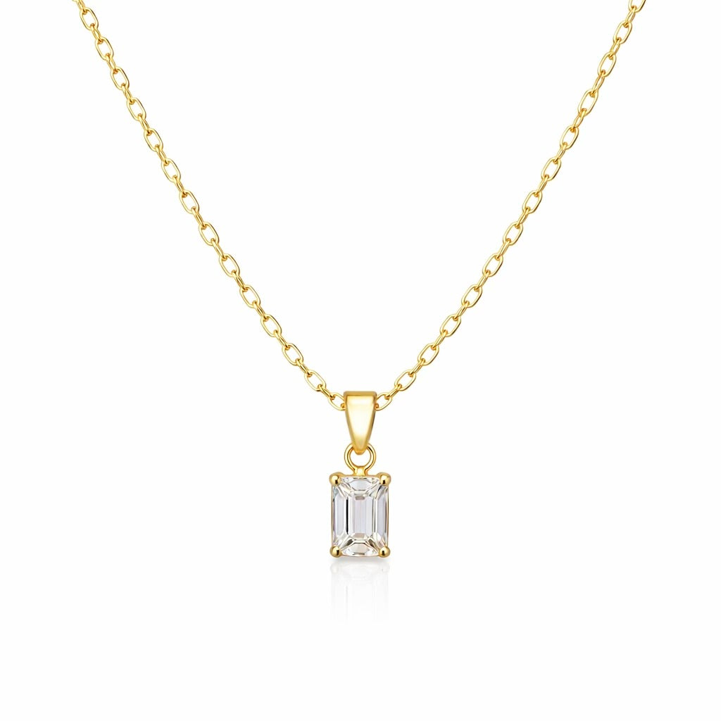A split bale solitaire necklace featuring a lab grown emerald cut diamond set in 18” 18k gold chain.