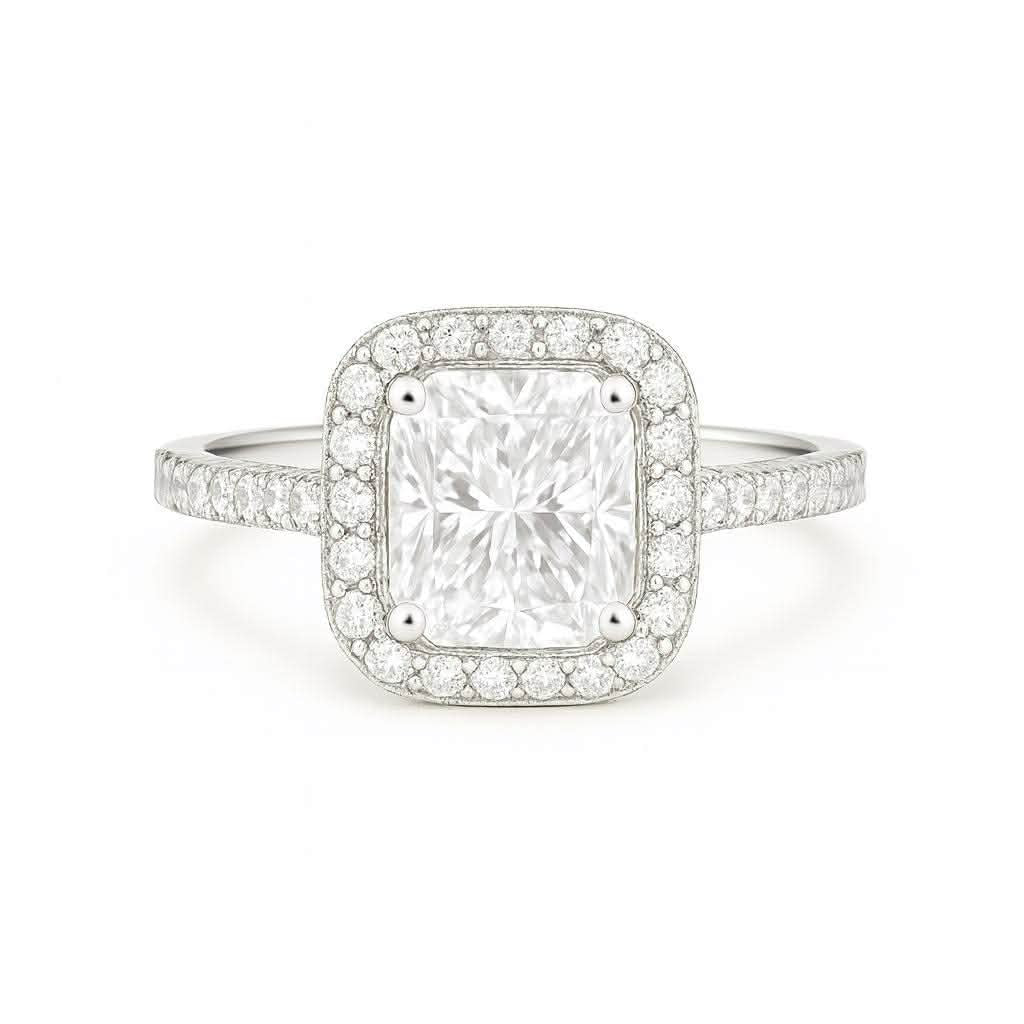 A classic halo design featuring a brilliant princess cut diamond accented with smaller diamonds surrounding the center stone and on each side of the band or you can have it customized in double pavé band too!